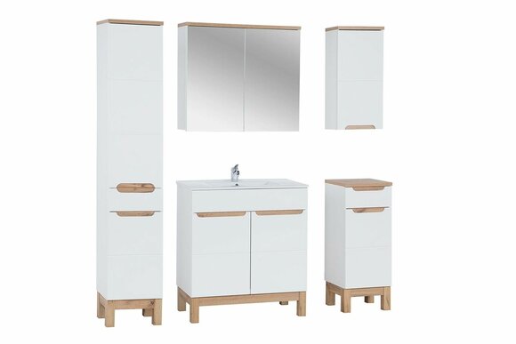 Der Set enthält och dräi praktesch Schief mat verschiddene Gréissten: de gréisste Schaf huet eng Längt vun 35 cm, Héicht vun 187 cm an Déift vun 33 cm, perfekt fir grouss Objeten oder Handticher ze lageren. Zwee weider Schief mat den Dimensiounen vun 35 cm x 86 cm x 33 cm an 35 cm x 70 cm x 20 cm bidden zousätzlech Stockraim fir méi kleng Saachen. Den dekorativen Schaf mat Spigel, mat senger Gréisst vun 80 cm Längt, 70 cm Héicht an 20 cm Déift, füügt en éléganten a funktionellen Highlight derbäi. Ideal fir neit Haus oder Buedzëmmer Renovatioune, dëse Miwwelset mécht all Raum méi attraktiv an funktionell.