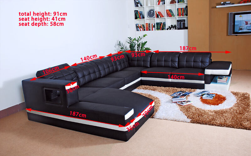 Entdeckt de sophisticateden 'Designer Canapé Sofa Ecksofa mat Hocker Garnitur Wunnlandschaft Polster', eng exzellent Ergänzung fir all modern Heem. Dëst Sofa kombinéiert Eleganz mat aussergewéinlechem Komfort dank dem héichwäertege **Premium Liederfaserstoff** (70% Lieder / 30% Polyester), deen eng luxuriéis Sëtzfläch bitt. De Sofa huet eng **verstellbar Längt vu ca. 187 x 339 x 280 cm** oder **280 x 339 x 187 cm**, déi perfekt an all Wunnraum passt. Mat enger **Héicht vun ca. 91 cm** an enger **Sëtzdéift vun ca. 58 cm** ass dëst Sofa eng invitativ Plaz fir sech zréckzeleeën an ze entspanen. De Sëtz ass ergonomesch entworf fir eng **Sëtz Héicht vun ca. 41 cm** ze bidden, wat optimal Komfort assuréiert.