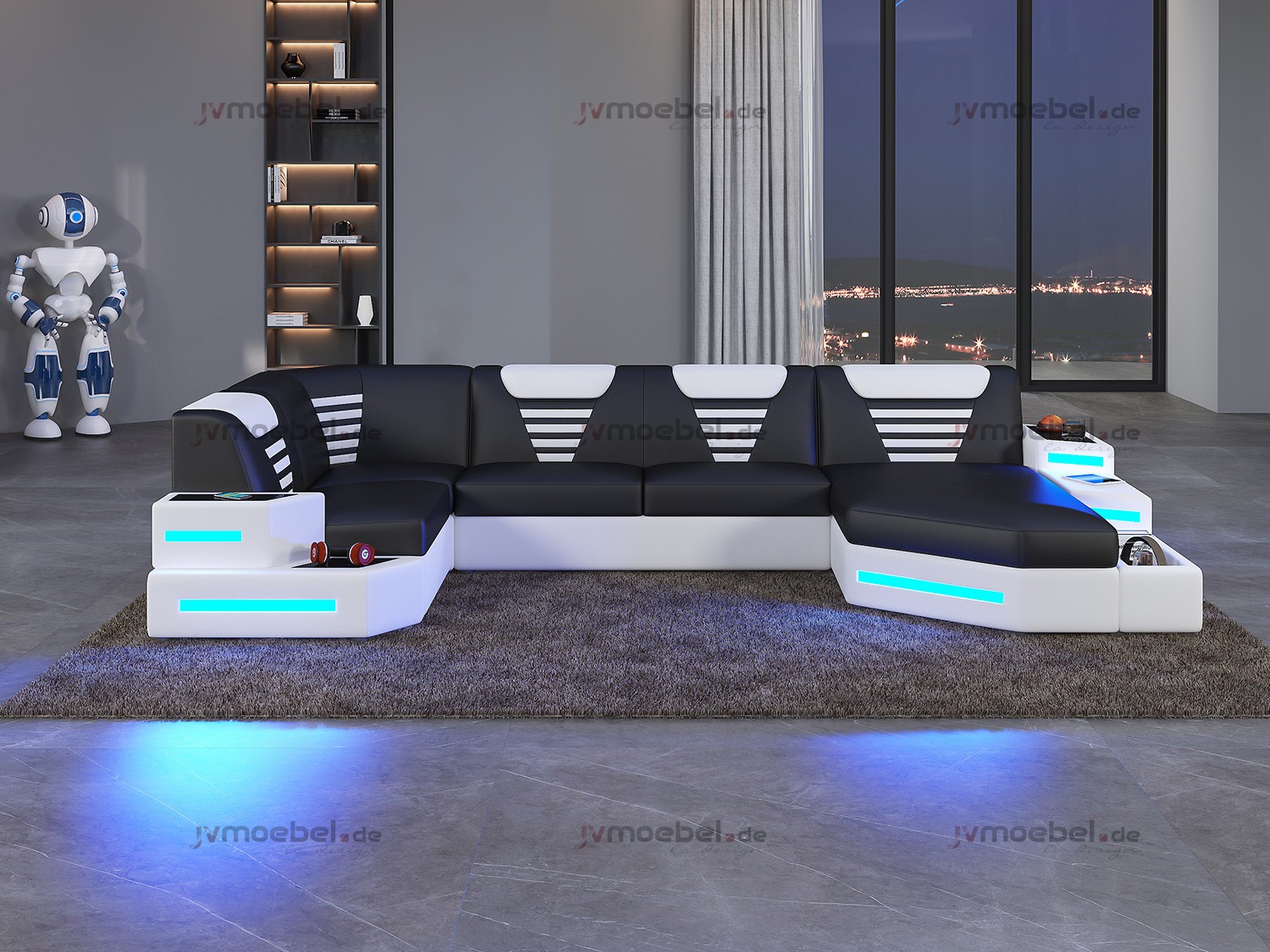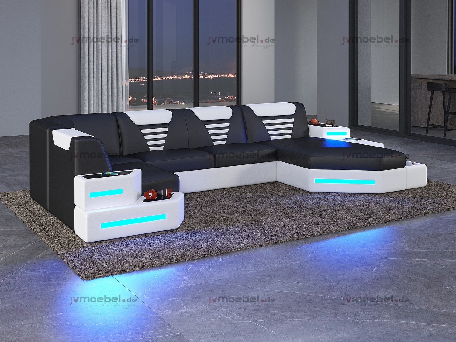 D'Flexibilitéit duerch seng U-Form mécht dësen Sofa ideal fir grouss Opstellunge wéi oppe Wunnzëmmer oder déi gemittlech Fernseheck. D'armen a Réckelehnen sinn esou entworf ginn, datt et perfekt ass fir sech z'relaxen an e Film ze genéissen oder einfach e Buch ze liesen. **Integriéiert LED Luuchten** bréngen eng modern a cool Atmosphär an ären Interieur, a schafen eng spektakulär Ambiance bei Nuecht. D'Varianten aus **Premium Textilstoff** oder **voller italiéinescher Lieder** kënnen op Ufro ugepasst ginn, fir datt et perfekt zu ärem perséinlechen Stil passt. Dëse Sofa ass net nëmmen eng Sëtzméiwegkeetsoptioun, mee en dramatescht Statement-Stéck fir all Interieur.