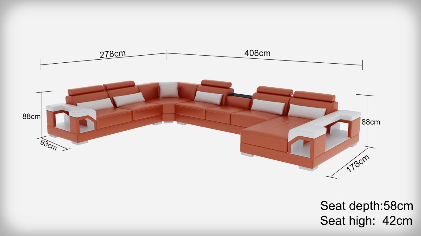 Entdeckt d'Eleganz an de Komfort vun der Eckgarnitur Ledersofa USB LED Luxus Wunnlandschaft Sofa Canapé Polsterecksofa. Dëst stilvolle Ecksofa bitt Iech net nëmmen en Ausdrock vu Raffinesséierung, mee och onberéierbare Komfort mat senger generaierer Sëtzhéicht vun ca. 42 cm an enger Sëtztiefe vun ca. 58 cm. Mat enger imponente Gréisst vun ca. 278 x 408 x 178 cm, oder alternativ ca. 178 x 408 x 278 cm, passt dëst Sofa perfekt an grouss Zëmmeren a bitt vill Plaz fir Famill a Frënn. D'Méiglechkeet vun enger fräier Faarfwahl erlaabt Iech, Är perséinlech Preferenz perfekt ofzestëmmen. De Sofabezug ass aus Premium Liederfaserstoff gemaach, deen eng optimal Kombinatioun vu 70% Lieder a 30% Polyester ass, a kann op Ufro mat anere luxuriéise Materialie wéi Echtlieder, Textilstoff oder Volllieder personaliséiert ginn. Dëst Sofa ass perfekt duerch seng 3 integréiert USB Ports fir Äert zäitgenëssescht Liewen auszedaachen, während déi optionale Erweiderunge wéi en elektresche Relax-Foussstütz, en Soundsystem iwwer Bluetooth, an eng Ënnerbuedembeleuchtung mat Fernsteierung an Faarfwiessel sécherstellen, datt Ären Alldag an Äert Heem komplett verännert ginn.