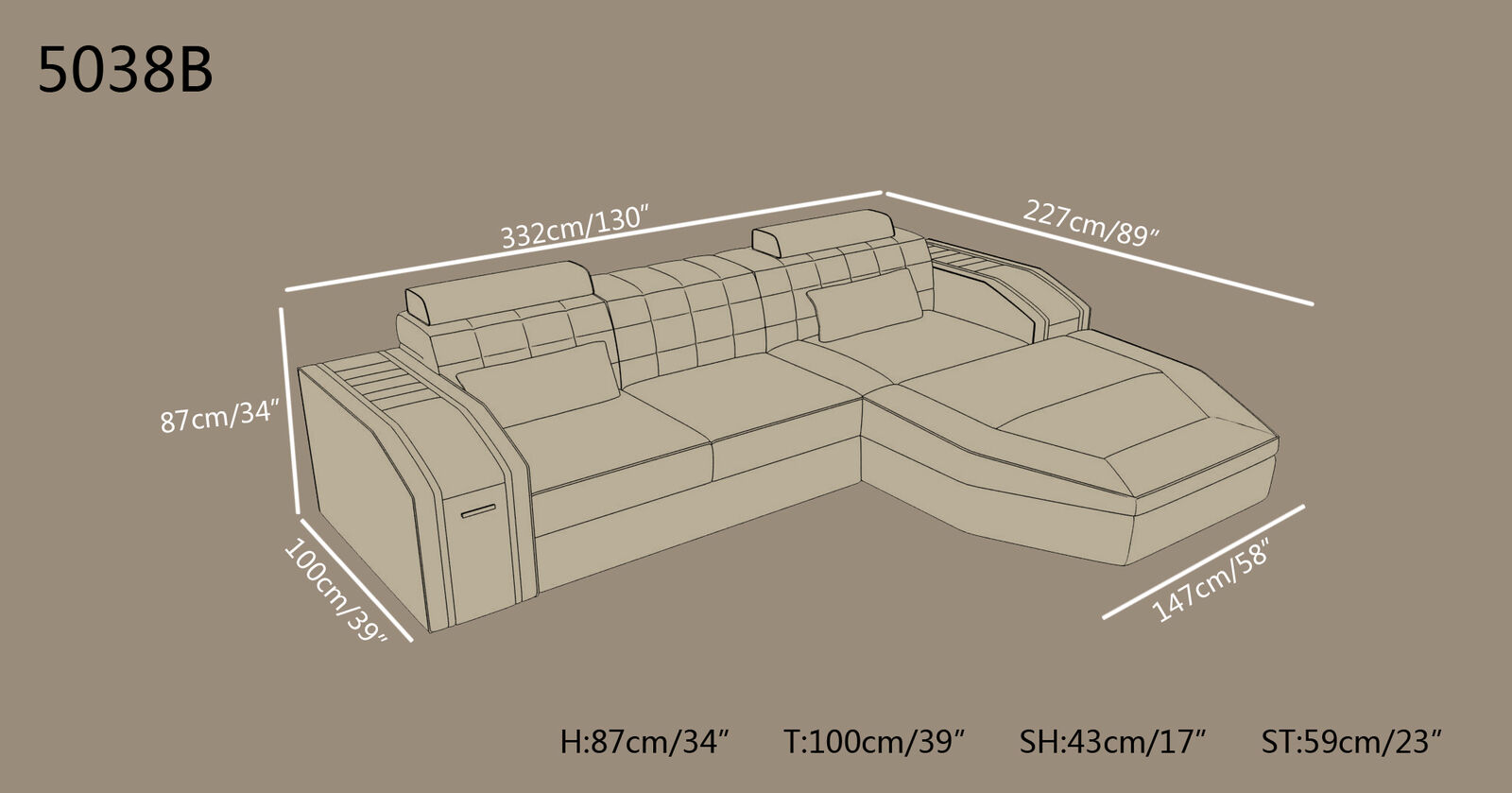 Den Beliichte Wunnzëmmer Liederdivan Sofa Eck Couche Wunnlandschaft Grouss ass déi perfekt Ergänzung fir äert Wunnzëmmer. Dëse stilvolle Ecksofa bitt eng luxuriéis a komfortabel Sëtzgeleeënheet mat senger L-Form an de Dimensiounen vu ca. 332 x 227 cm oder 227 x 332 cm. Mat enger Gesamthéicht vun ca. 87 cm an enger Déift vun ca. 100 cm ass et en ideale Treffpunkt fir d'ganz Famill oder Frënn. D'Sëtzhéicht vun ca. 43 cm an d’Sëtzdéift vun ca. 59 cm garantéieren optimal Ënnerstëtzung a Komfort. Dir kënnt d'Faarf no ären eegene Präferenzen wielen, fir datt d'Divan perfekt an ären Dekor passt. Den Sofa kënnt mat engem héichwäertegen Premium Liederfaserstoff (70% Lieder / 30% Polyester), wat eng elegant Optik an eng laangwiereg Haltbarkeet garantéiert.