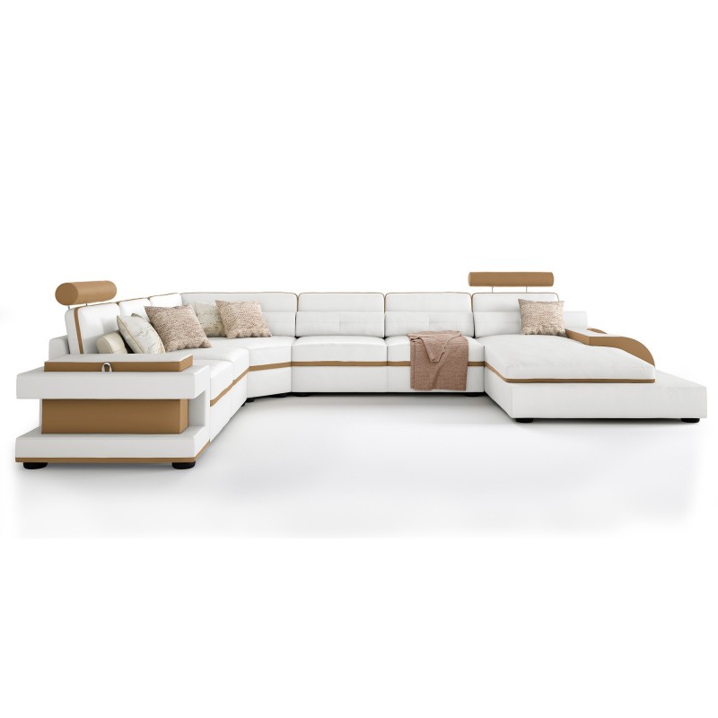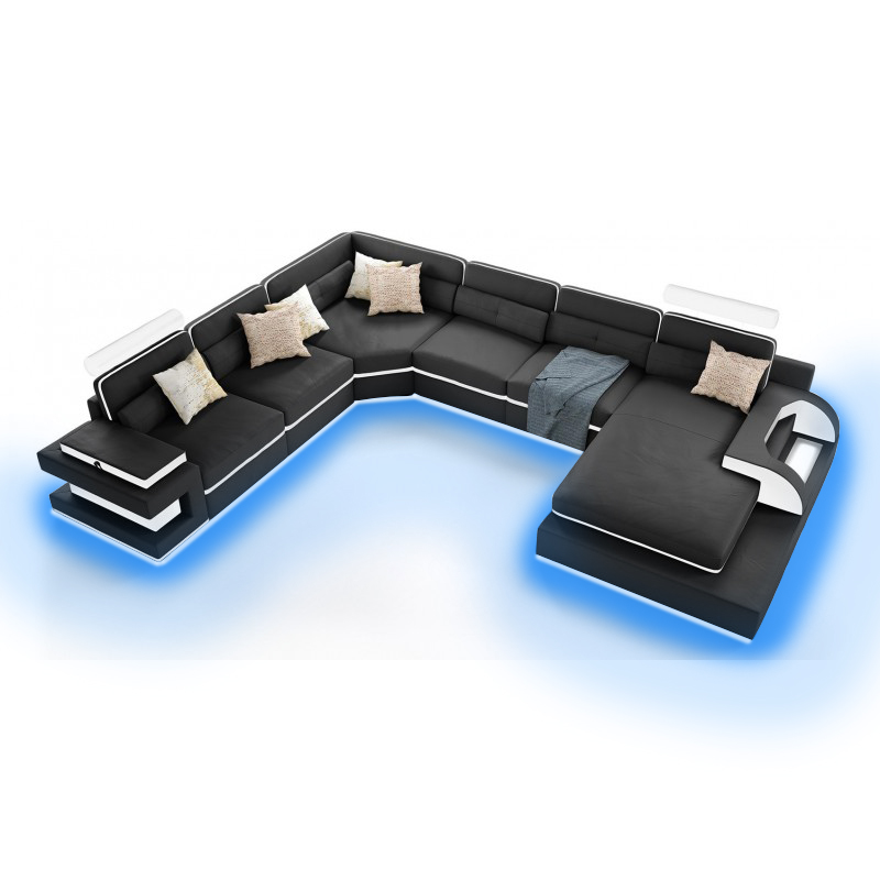 De 'Gemittlech Wunnambiente mat eisem charmante U-Form Ecksofa' ass déi perfekt Ergänzung fir all modernen a stilvollen Wohnraum. Egal ob fir entspaanten Owend mat Frënn oder als luxuriéis Schlafméiglechkeet – dëse Sofa passt sech Äre Besoinen un. D'Réckelehnen an déi bannenzäit vun den Aarmleenen bidden extra Ënnerstëtzung an Komfort, während déi reschtlech Polsterung aus héichwäertegem Kënschtleeder an der gewielter Faarf d'Ästhetik op de Punkt bréngt. Egal ob als Haaptakzent an Ärer Wohnzimmer oder als gemittlech Liesnisch an engem gemittleche Raum, dësen Sofa wäert e laang halen Androck hannerloossen.