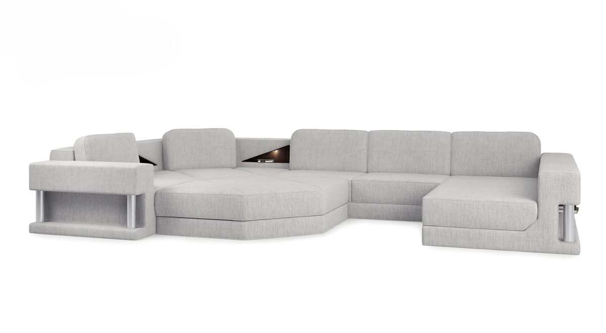 Fir déi, déi d'Upszouvoll erliefe wëllen, ass d'Optioun fir elektresch Relax-Foussstütz verfügbar, déi fir eng personaliséiert Sëtzpositioun suergt. Becherhalter mat Frigo, de Sound System mat Bluetooth Konnektivitéit an ënnerbuedem Beleuchtung mat Fernsteierung bréngen extra Fonctionalitéit an Afloss an Ären Living Raum. Des 'Ecksofa' ass optimal fir e grousse Familjenowend oder e Filmowend mat Frënn ze genéissen, dank sénger Gréisst an sengem Komfort, deen eng ideal Ofschaltefräiheet bitt. De robuste Bau aus echtem Holz an déi Federsystem Sëtzkëssien suergen dofir, datt dëst Sofa e laangjärege Begleeder an Ärem Heem gëtt.