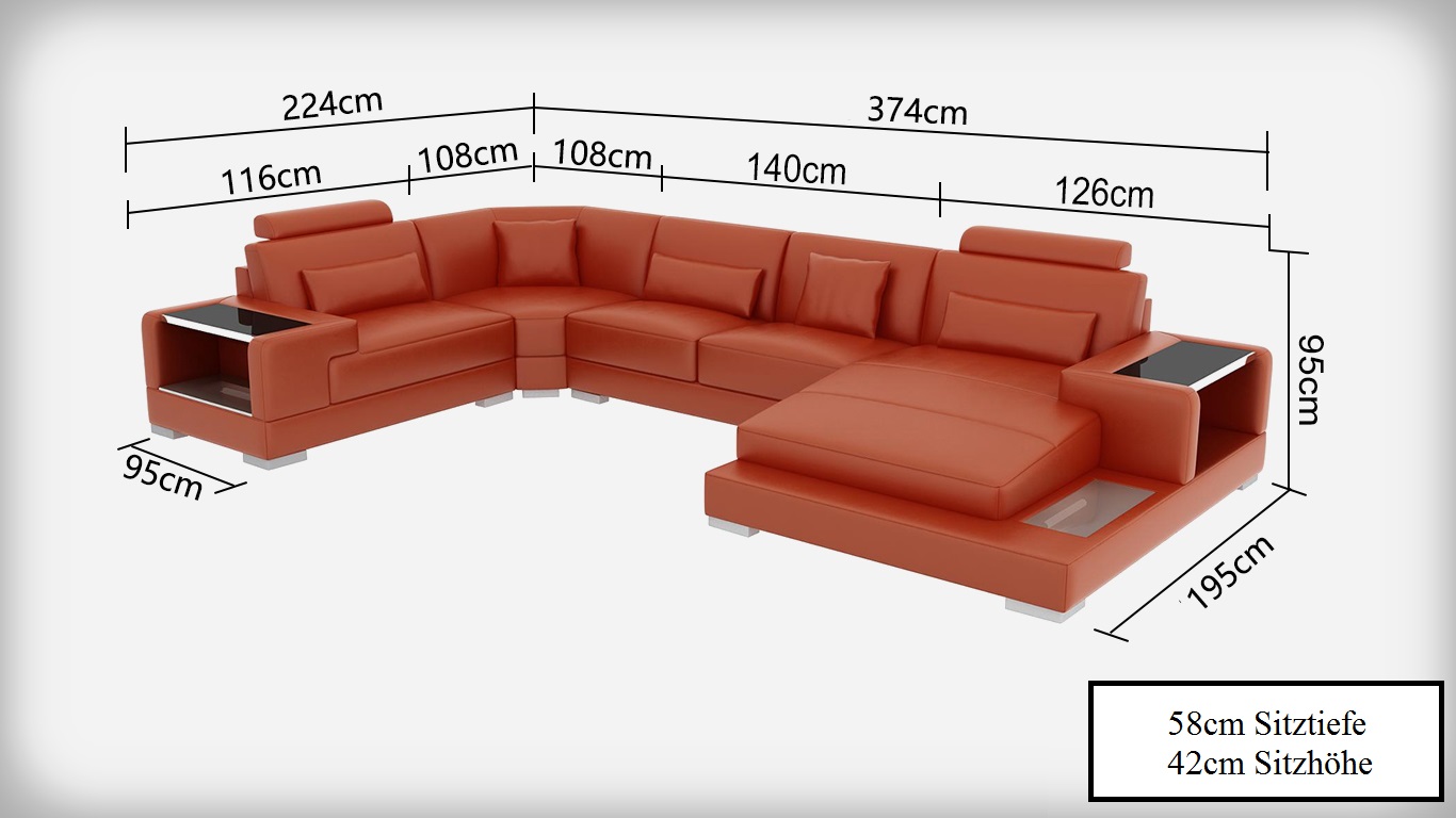 Entdeckt déi ultimativ Kombinatioun vun Komfort a Stil mat der Wunnlandschaft Polstereck Ecksofa mat USB Garnitur Landschaft Lieder Wetzlar. Mat Dimensiounen vun ongeféier 358 x 185 cm, ass dëst Präzisiounsmeeschterwierk perfekt fir all modern Heem. Déi héichwäerteg Veraarbechtung aus Premium Liederfaserstoff (70% Lieder / 30% Polyester) suergt fir eng onvergleichlech Eleganz a Liewensdauer. Den integréierte USB-Klickautomatik mat dräifachem Steckerplaz erlaabt Iech Elektronik einfach unzeschléissen während Dir entspaant. D'Sëtz Héicht vun 42 cm an d'Sëtzdéift vu 60 cm suergen dofir, datt jiddereen an der Famill de maximalen Komfort erliewen kann.