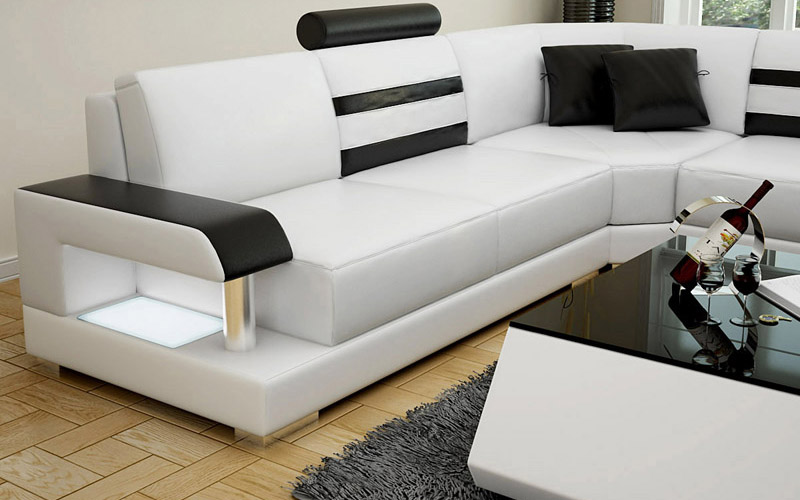 D'Ledercouch ass net nëmmen e Stéck Esthetik mee och e Symbol vu Praktikabilitéit. Mat enger Innenstruktur aus echtem Holz a Federkär ass dës Garnitur robust an haltbar. Dir hutt d’Méiglechkeet, tëscht verschiddene Materialien ze wielen, wéi Premium Echtlieder fir en oppréis Pris vun 399,00 Euro oder Premium Textilstoff fir 149,00 Euro. D'Rëndslieder aus Italien, dat fir d’Sëtzflächen an Réckelen benotzt gëtt, ass besonnesch haltbar a resistent géint Verschleiß. Fir déi, déi besonnesch op de Lieder look stinn a bereet sinn, an eng Liewensqualitätsinvestitioun ze goen, ass d’Optioun vun Premium Vollleder och verfügbar. Perfekt fir grouss Wunnzëmmer oder Open Space Raim, wäert dës Eckcouch mat sengem modernen Design an héijer Funktionalitéit all Wunnfläch an en Aenfänkt verwandelen.