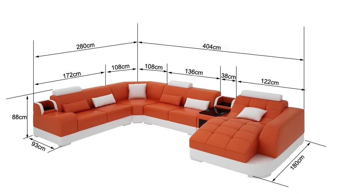 De 'Liederdivan Designer Divan U-Form Wunnlandschaft Canapé Polstersofa Ecksdivan' ass eng elegant an zäitgenëssesch Wiel fir jiddereen, deen seng Wunnzëmmer op e neien Niveau brénge wëll. Mat enger beeindruckender Dimensioun vun 280 x 404 x 180 cm oder 180 x 404 x 280 cm, bitt dësen Eckdivan genuch Plaz fir déi ganz Famill an all Är Gäscht. D'Struktur vum Sofa beinhalt en internen Holzrahmen, wat fir extrem Stabilitéit an Dauern suergt. Dir hutt d'Méiglechkeet, aus verschiddene Materialien ze wielen, wéi dem Premium Liederfaserstoff oder dem italienesche Rëndslieder, wat mat sengem narbenäre Textur extra wéi bis zu 2,50 mm Stäerkt kënnt. Dës Optioune erméiglechen et, de Sofa un Ären individuellen Stil unzepassen, an hinnen d'Fräiheet gibft, d'Faarf ze wielen, déi Äert Interieur am beschten ergänzt.