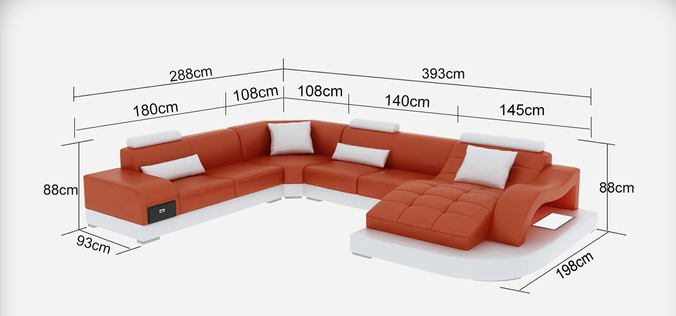 D'**Lieder Eck Sofa Eck Wunnlandschaft Garnitur Design Modern Couch Nei Sofae USB Nei** ass déi perfekt Ergänzung fir Äert Heem, verspillt mat engem modernen Touch an aussergewéinlechem Komfort. Mat enger Ausmoos vu entweder **ca. 288 x 393 x 198 cm** oder **ca. 198 x 393 x 288 cm** an enger Héicht vun **ca. 88 cm**, bitt dës Garnitur genuch Plaz fir déi ganz Famill. Den **Premium Liederfaserstoff (70% Lieder / 30% Polyester)** garantéiert béid Eleganz an Langlebigkeit. Ausserdeem kënnt d'Sofa mat enger **USB-Klickautomatik (3-fach Steckplatz)**, déi et erlaabt, Är Elektronik mam gréisstem Komfort opzeluede.