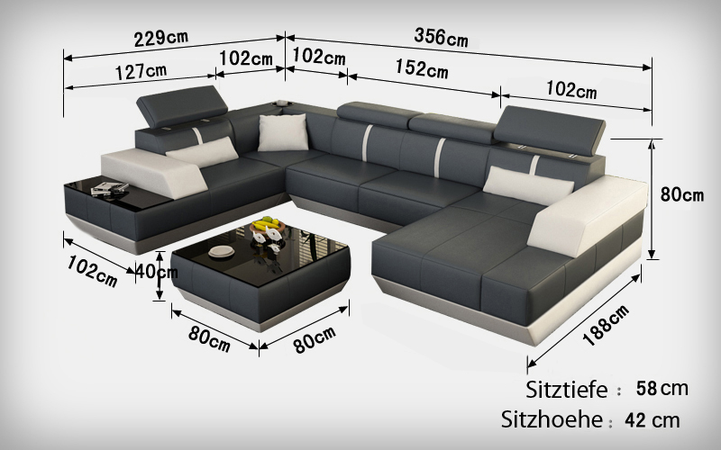 Entdeckt déi bemierkenswäert 'Modern Sitzgruppe Ledersofa Polster Ecksofa Sofa Couch Wunnlandschaft K5015 + USB', déi als de perfekte Mëttelpunkt fir är Wunnzëmmer gedéngt. Mat enger grousser Dimensioun vun entweder **188 x 356 x 229 cm** oder **229 x 356 x 188 cm**, bidd dës Sofawunnlandschaft genuch Plaz fir d'ganz Famill oder Frënn. D'Héicht vun der Couch läit bei **80 cm**, a mat enger Sëtz Héicht vun **42 cm** a Sëtzdéift vun **58 cm** suergt se fir aussergewéinlech Komfort. En integréierten USB-Klickautomatik mat **3 Steckplazen** erméiglecht et Iech, är elektronesch Apparater bequem vun der Sofa aus opzelueden. D'Sofa kënnt an engem Premium Liederfaserstoff (70% Lieder / 30% Polyester) mat enger oppener Faarfwahl, an optiounsweis kann ët och a Premium Echtlieder oder Textilstoff gehalen ginn, fir de raffinéiertste Look an ärer Heem ze bréngen.