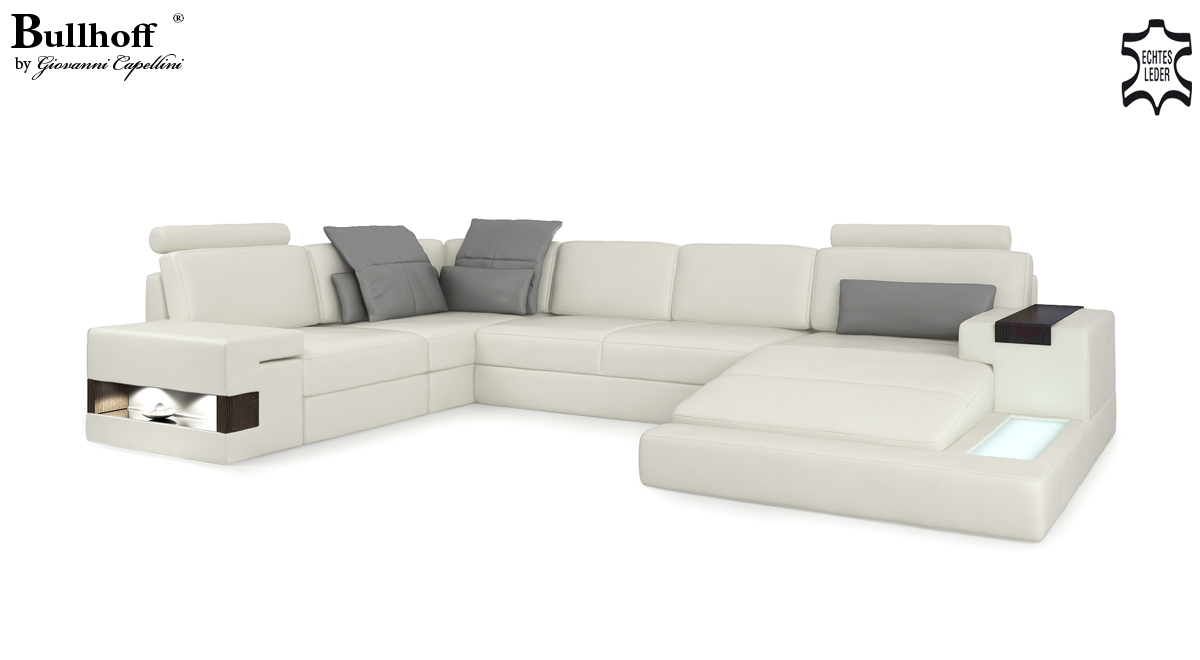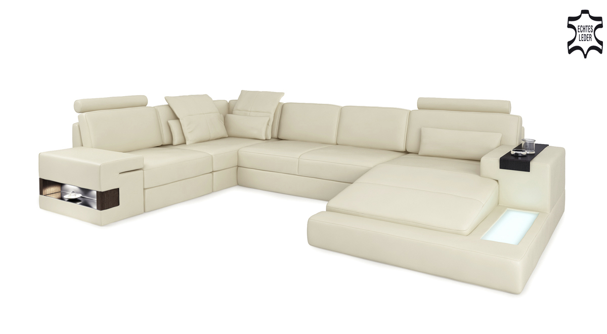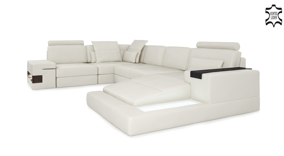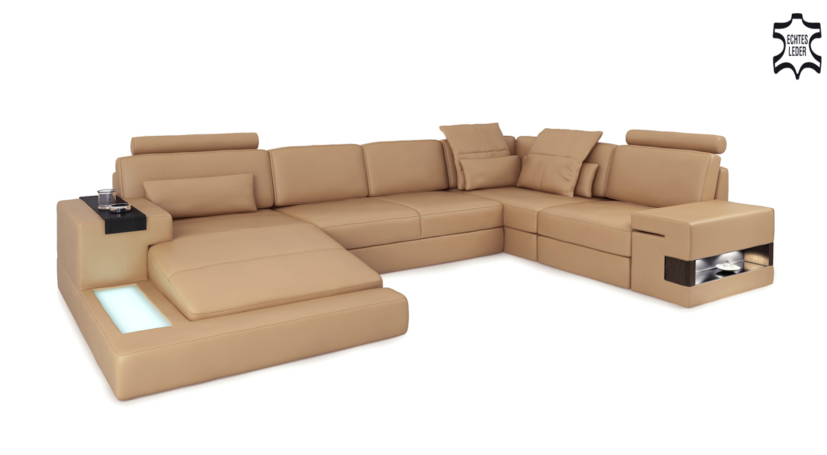Verschidde Varianten stinn zur Auswiel, dorënner de Grupp 1 aus Premium Konschtlieder ouni zousätzleche Käschten, de Grupp 2 mat Premium Echtlieder mat engem Oppräis vun +399,00 EUR an de Grupp 3 mat Premium Textilstoff och ouni zousätzlech Käschten. D'Wunnlandschaft ass perfekt fir eng grouss Famill ze empfänken oder fir Gäscht a relaxe sozialen Ëmfeld. D'Innenstruktur aus echt Holz a Federkär suergt fir exzellente Sëtzkomfort an Durabilitéit. Dank der italienescher Rëndslieder ass d'Veraarbechtung besonnesch edel, an d'Narbenlieder hunn eng Dickt vu bis zu 2,50 mm, wat zu enger stabiler a gemittlecher Sëtzpositioun bäidréit.