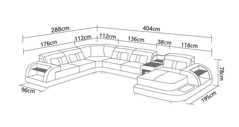 Entdeckt de raffinéiert Luxus vun der Luxus Wunnlandschaft Canapé Polster U Form Eckgarnitur Ecksofa Canapé XXL Grouss + USB, déi e stilvollen Akzent an all Wunnberäich setzt. Mat Dimensiounen vun entweder 195 x 404 x 288 cm oder 288 x 404 x 195 cm, bitt dës grouss a bequem Ecksofa genuch Plaz fir déi ganz Famill oder eng Grupp vu Frënn. D'Héicht vum Canapé ass ca. 78 cm, mat enger Sëtz Héicht vun 42 cm, déi eng perfekt Kombinatioun vu Komfort a Funktionalitéit ubitt. Dës Wunnlandschaft erlaabt Iech Kräizgang ze wielen tëscht verschidden Optiounen, dorënner de bezuelbare Liederfaserstoff oder déi luxuriéis Optiounen wéi Echt- oder Volllieder a verschiddene Faarwen. Fir nach méi Stil a Funktionalitéit ze integréieren, kënnt Dir en passenden Canapédësch mat engem Oppräis vun 439,00 Euro dobäi bestellen.