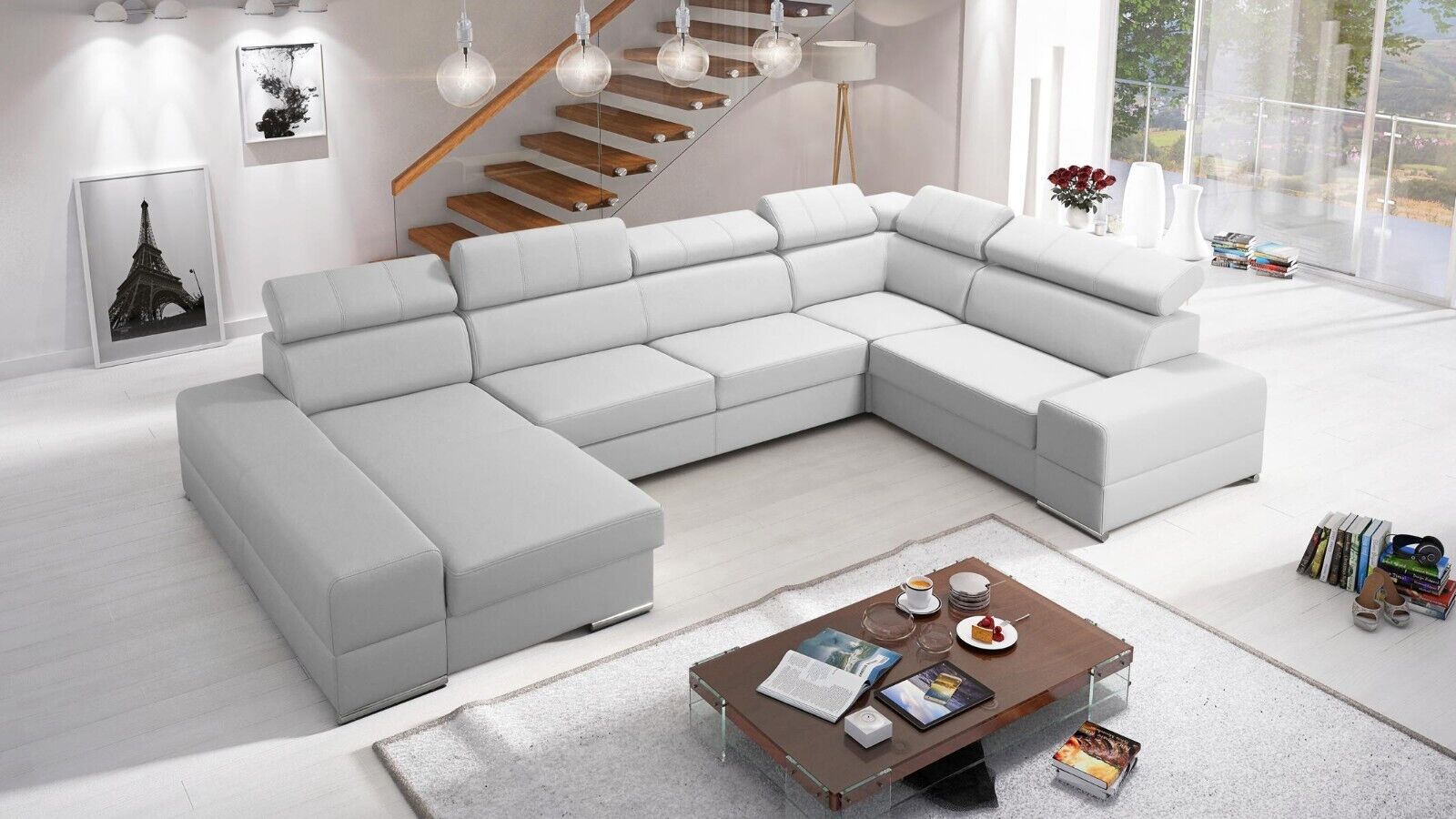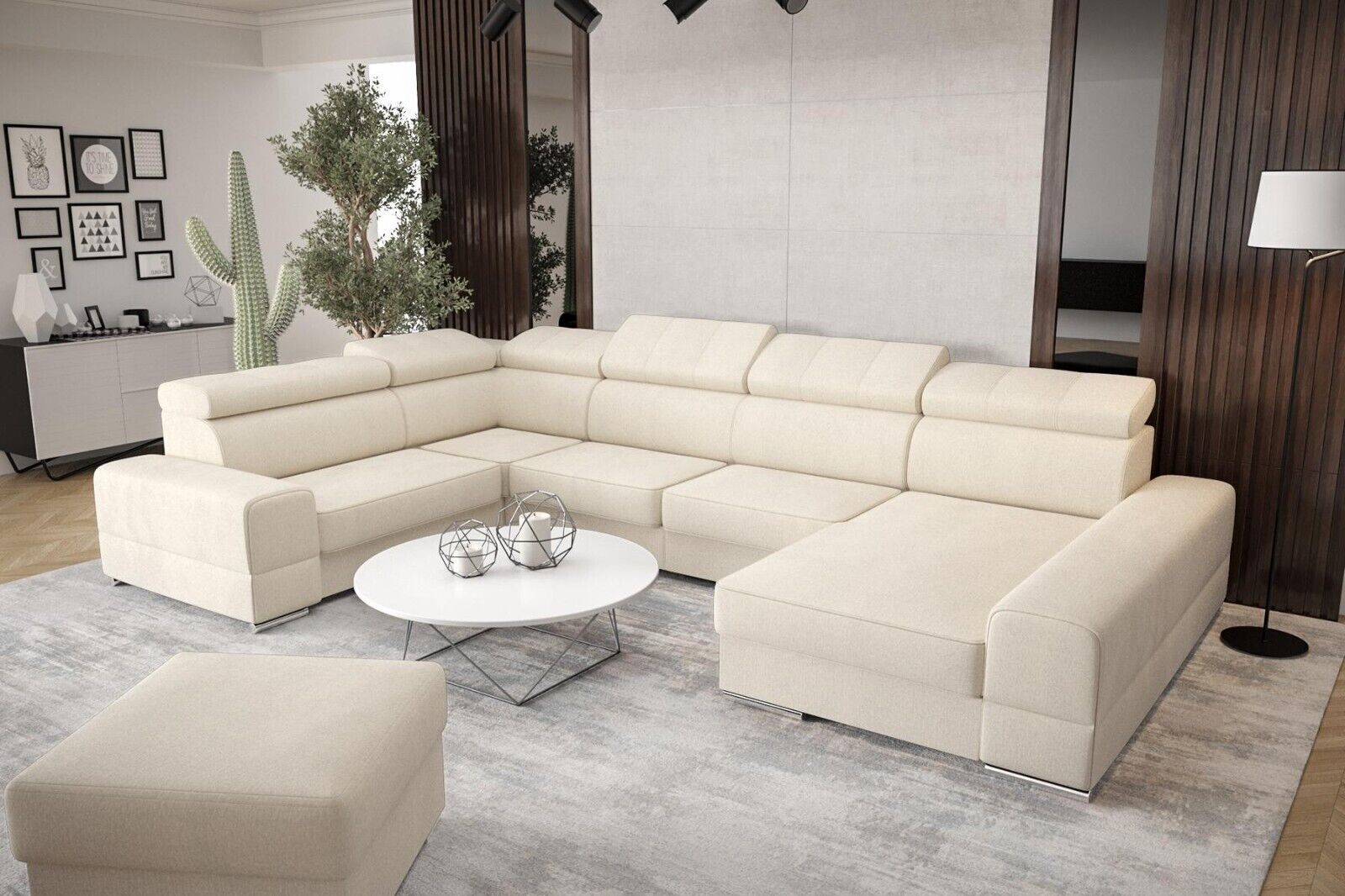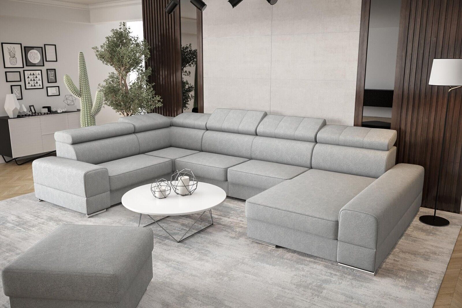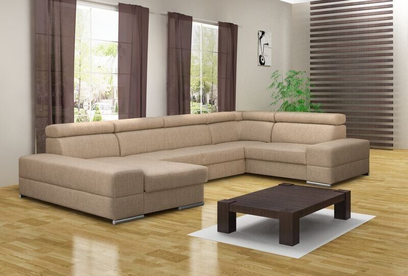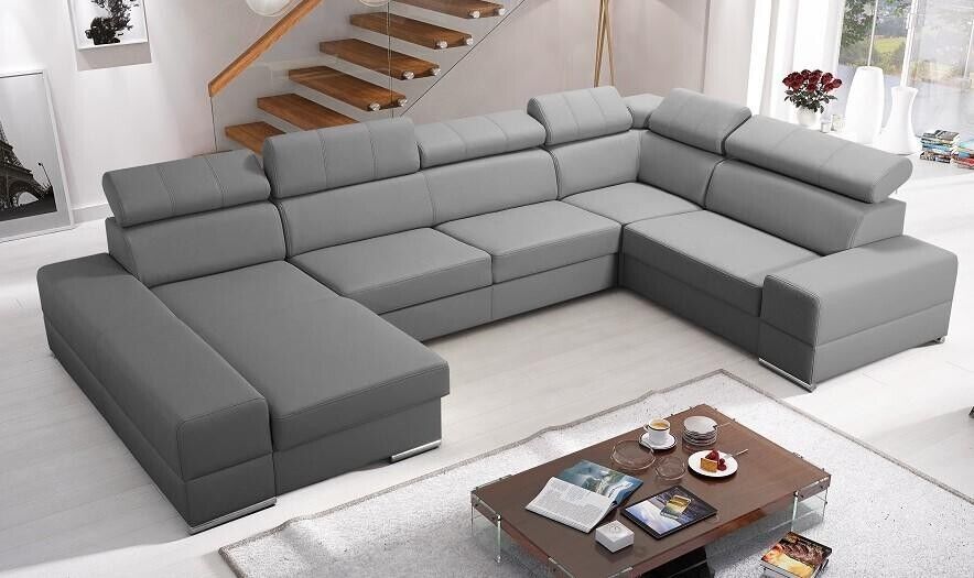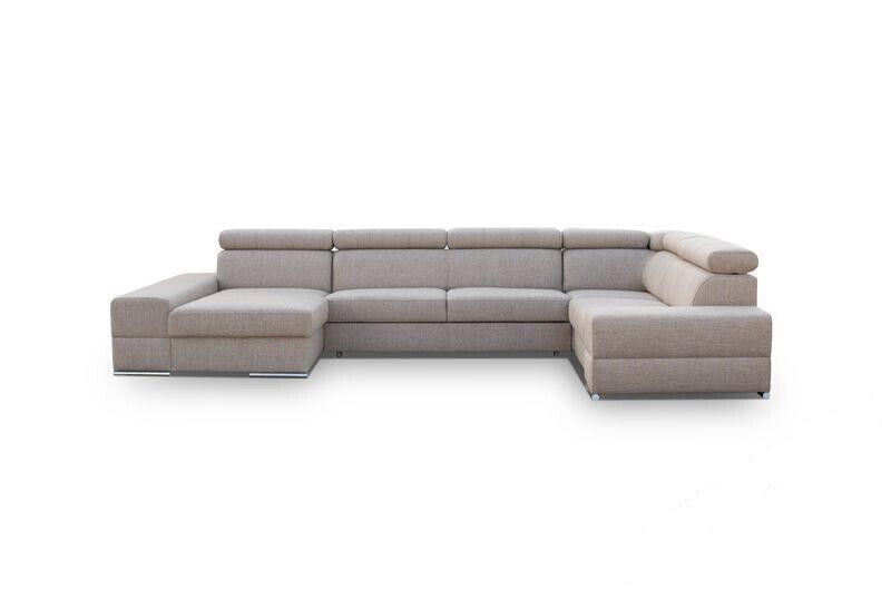Eng zousätzlech Betterkëscht ass am Basispräis abegraff an erlaabt Iech einfach an elegant extra Bettdecken oder Këssen ze späicheren. Fir eng nach méi beandrockend Atmosphär kënnt Dir optiounell eng LED Ënnerbuedem Beliichtung fir e klenge Präisopschlag derbäi bestellen, wat dëst Miwwelstéck nach méi erausstécht. D'Eckcouch ass ideal fir grouss Raim oder als zentral Element an engem oppene Living-Bereich. Egal ob Dir e gemittleche Filmowend plangt oder en Ecker fir Relaxatioun schafe wëllt, dës modern Polstermébel suergen iwwerall fir Komfort a Stil.