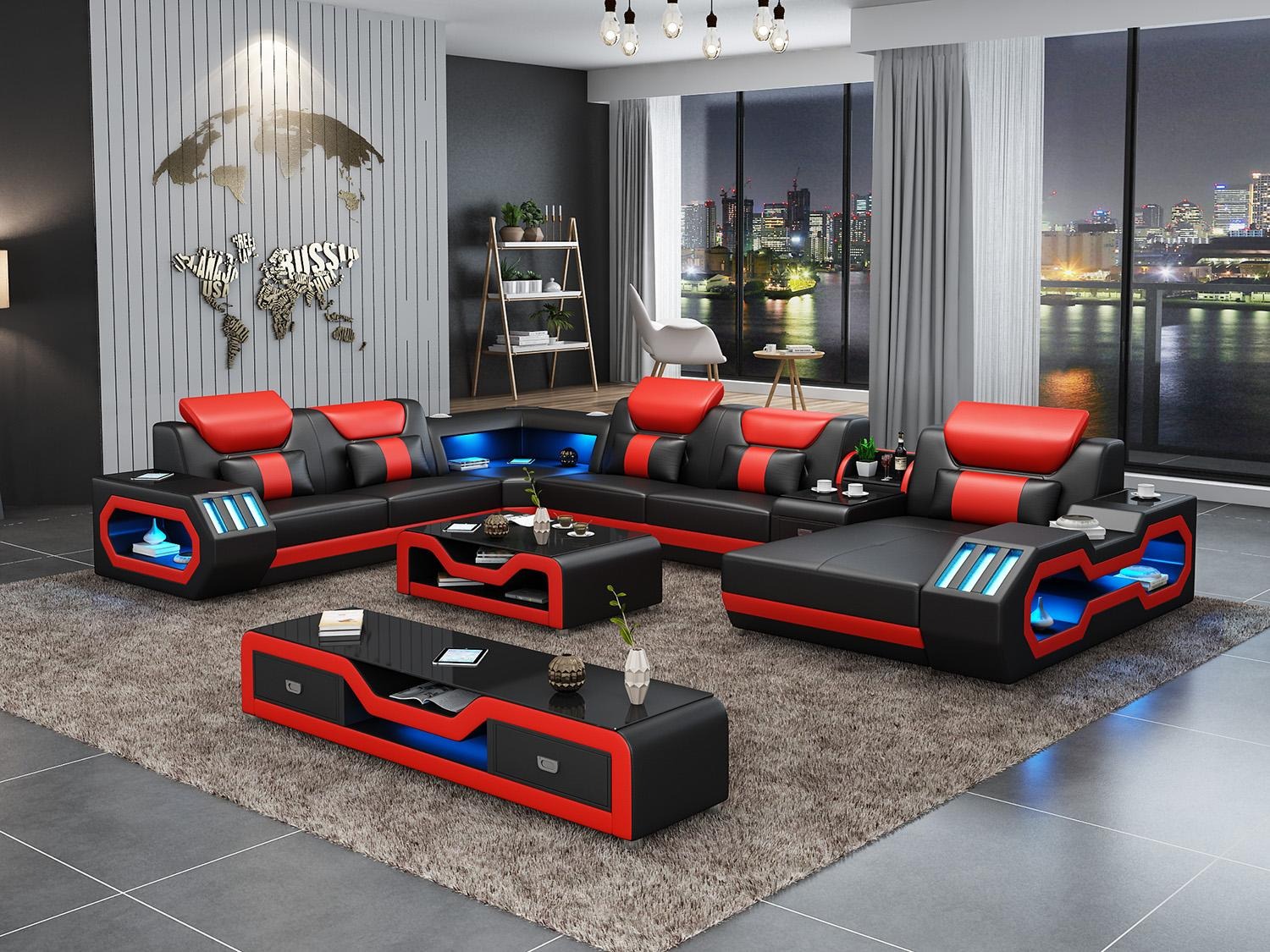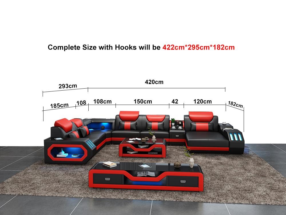 Dëse Sofasett kënnt och mat engem raffinéiertem **Couchtisch** vun **120 x 70 x 42 cm** a bietet Plaz fir Är dekorativ Objeter oder Kaffispaus Essentials. Fir en nach méi exklusive Genoss, ass d'Sofa optional mat **elektrescher Relax-Foussstütz**, **Sound-System iwwer Bluetooth**, an **Ënnerbuedembeleuchtung** mat engem Faarwewiessel erbäizukréien. Setzt Glenz an Äert Heem mat der vermëtzechter **italienesch Rëndfleder** oder dem robusten hëlzirene Bannestruktur, entwéckelt fir Langlebtegkeet a Stabilitéit. Egal ob Dir relaxéieren wëllt nom haarden Dag oder Frënn a Famill ëffentlich oblueden, dës **Eckcouch** bréngt Stil a Fonctionnalitéit zesummen, fir en Heem ze kompletéieren dat Dir gär hutt.