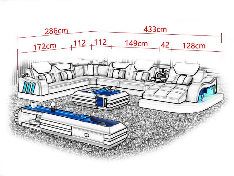Dëse Sofa geet mat engem passenden **Couchtisch** vun 120 x 70 x 42 cm, an huet praktesch **drei USB Ports integréiert**, wat et einfach mécht Är elektronesch Geräter oplueden. Fir déi, déi Stroum a Komfort schätzen, sinn optional **elektresch Relax-Foussstützen** verfügbar, déi um Preis vu +399 EUR kënne bäigefüügt ginn, well wéi e komplext **Soundsystem iwwer Bluetooth** fir déi voll Multimedia-Erfarung. Fir en extra visuelle Flair ze addéieren, kënnt Dir och ënnerbuedem Beliichtung mat Fernsteuerung a Faarfwiessel wielen. Perfekt fir grouss Versammlungen oder fir eng gemittlech Famillenowend, ass dësen Ecksofa eng stäerk Verwaltungsléisung, déi sech nahtlos un all Notzungsszenario upasst.