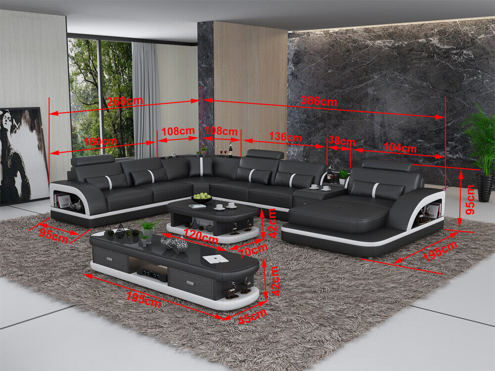Déi luxuriéis Liederzofa Eckzofa Garnitur ass eng imponent U-Form Canapé déi ideal ass fir all elegant Stot. Mat enger Gréisst vun ca. 268 x 386 x 195 cm oder 195 x 386 x 268 cm, bitt dës Zofa genuch Raum fir ganz Famill oder Frënn opzefänken. Dës Garnitur ass aus engem héichwäertege Premium Liederfaserstoff zesummegesat, deen eng Mëschung aus 70% Lieder a 30% Polyester ass. Mam Design ass et einfach de perfekte Faarwmatch fir Äert Interieur ze fannen duerch eng fräi Faarfwahl. Déi stabil Konstruktioun mat engem Innengestell aus echtem Holz garantéiert net nëmmen Komfort, ma och Langlebtegkeet.