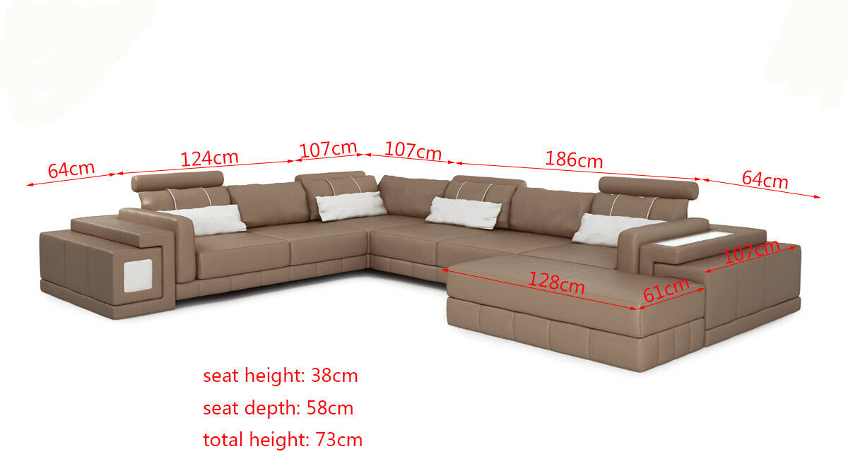 Déi modern 'Léiercouch U-Form Couch Wunnlandschaft Eckcouch Garnitur Design Modern Sofa nei' ass déi perfekt Ergänzung fir Äert Wunnzëmmer. Mat enger imposanter Gréisst vun 295 x 357 cm oder 357 x 295 cm, bitt des Eckcouch genuch Plaz fir d'ganz Famill oder Frënn ze empfänken. Hie gouf aus Premium Liederfaserstoff hiergestallt, deen aus 70% Lieder an 30% Polyester besteet, wat net nëmme fir Komfort, mee och fir eng laang Liewensdauer suergt. D'Uewerflächen ginn duerch faarbegläichen Premium Kënschtlieder ergänzt, wouvun den Innere Kader aus echtem Holz besteet, fir eng extra Stabilitéit. D'Dëscht vun 107 cm an enger Sëtz Héicht vun 38 cm maachen dës Couch extrem bequem fir laang Owender.
