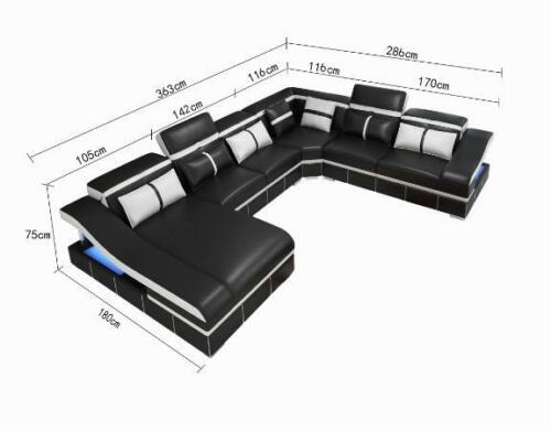 De 'Luxus Eck Ecksofa U-Form Wohnlandschaft Sofa Canapé Stoff Garnitur Modern Sofas Nei' ass déi perfekt Kombinatioun aus Stil, Komfort a Funktionalitéit. Dëse Sofa bitt eng kënschtlech Premium Optik mat engem héichwäerteg veraarbechtete Materialmix vun Liederfaserstoff, dee bis zu 70% aus Lieder bestinn, kombinéiert mat haltbarem Polyester. Mat senge grousse Moossen vun entweder 180 x 363 x 286 cm oder 286 x 363 x 286 cm, passt sech dës Wohnlandschaft ideal un all grousszäiteg wunnhäuslesch Ëmgéigend un. D'Sëtz Héicht vu ronn 45 cm an d'Sëtzdéift vun ongeféier 58 cm suergen fir e gemütlecht a komfortabelt Sëtzerliefnis. D'Faarfauswiel erlaabt et Iech, de Sofa perfekt op Ären individuellen Interieur ofzestëmmen.