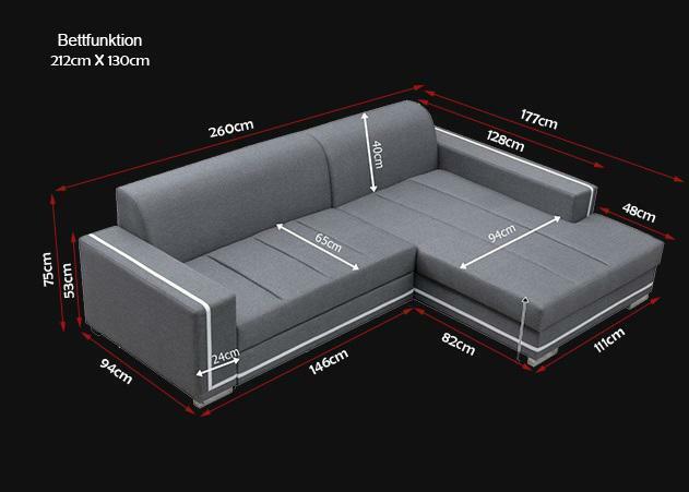 Den 'Canapé Schlofcouch Designer Canapé mat Bettfunktioun + Bettkëscht Eckcanapé Couch NEI' ass eng stilvoll Kombinatioun vun Design an Funktionalitéit, perfekt fir jiddereen, deen Eleganz an hire Wunnraum bréngen wëll. Dëst Ecksofa huet eng L-Form mat den Dimensiounen vun ca. 260 x 177 cm, wat genuch Plaz bitt fir sech ze entspanen oder mat Frënn ze versammelen. De Canapé kënnt an enger breeder Palette vun Faarwen a Materialien déi Dir op Är Besoinen ugepasst kënnt - vun Stoff bis Premium Kënschtleeder an verschiddene Präisgruppen. Eng vun den zentrale Feature ass déi integréiert Bettfunktioun mat enger Leefläch vun ca. 212 x 130 cm, déi perfekt ass fir spontan Iwwernuechtungen. Ausserdeem enthält de Canapé eng Bettkëscht, déi praktesch extra Verstauungsméiglechkeet bitt.