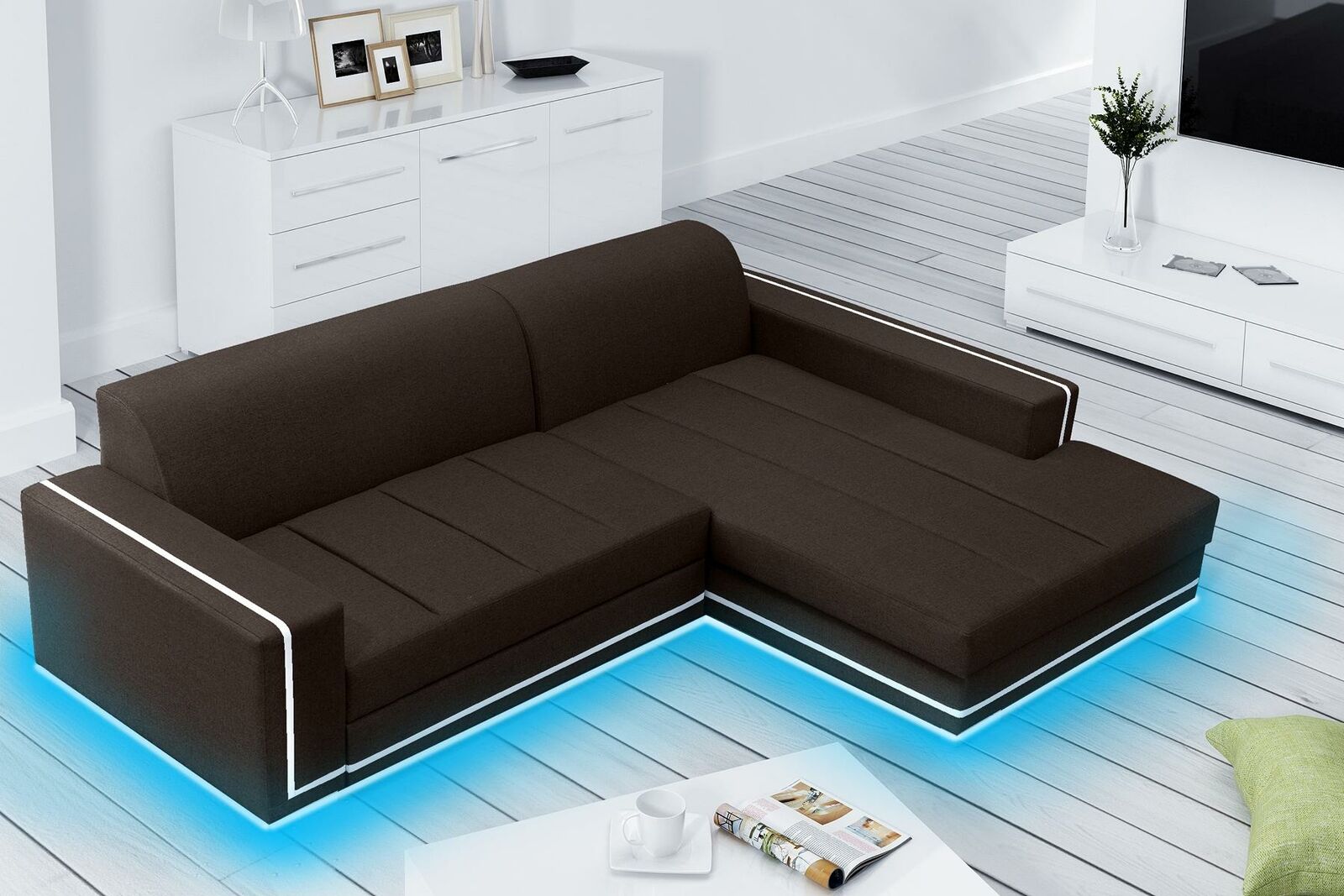 Fir déi, déi eng nach méi ausgeklügelten Atmosphär wëllen, gëtt et d'Méiglechkeet, Ënnerbuedem LED Beliichtung géint en Oppräis ze integréieren, anescht wéi déi Standard Liwwerung déi schonn maximal Komfort garantéiert. Dat robustt Innengestell aus richtegem Holz a mat Federkern-Technologie garantéiert Haltbarkeet an Zefriddenheet iwwer vill Joren. Ob Dir Är Liiblingsserie kuckt oder einfach nëmmen entspaant wëll liesen, dësen Canapé ass entworf fir eng komfortabel Notzungszäit ze garantéieren an ass ideal fir modern Heemänner wéi och méi klassesch ausgestatten Appartementer. Seng Spigelverkéiert Optioun erméiglecht et, d'Aster einfach un de Layout vun Ärem Raum unzepassen, ouni zousätzlech Käschten. Déi héichqualitativ Veraarbechtung mécht dëst Mëbelstéck zu enger léiwer Investitioun fir Ären Doheem.
