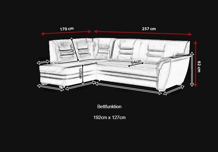 Den 'Canapé Schlofcanapé Designer Canapé mat Schlaffunktion + Bettkësch Eckcanapé Couch NEI' ass en exklusive Schlofcanapé, deen sech duerch seng Flexibilitéit an stilvollen Design auszeechent. Mat de Moossen vun ongeféier 170 x 257 x 92 cm passt dësen Canapé perfekt an all Wunnraum, a bitt déi optimal Plazéierungsméiglechkeeten duerch seng L-Form. Eng grouss Palette vu Faarwen ass verfügbar, fir dass Dir Är Lieblingsfarf auswielt kënnt, a wielt tëscht héichwäertegem Stoff oder Premium Kënschtleeder, jee no Ufuerderungen an Budget. De Präis enthält esou schwéier Eegeshaften wéi d'Bettsfunktioun mat enger Leefläch vu ronn 192 x 127 cm an eng praktesch Betterkëscht, déi zousätzlech Späicherplaz ubitt.