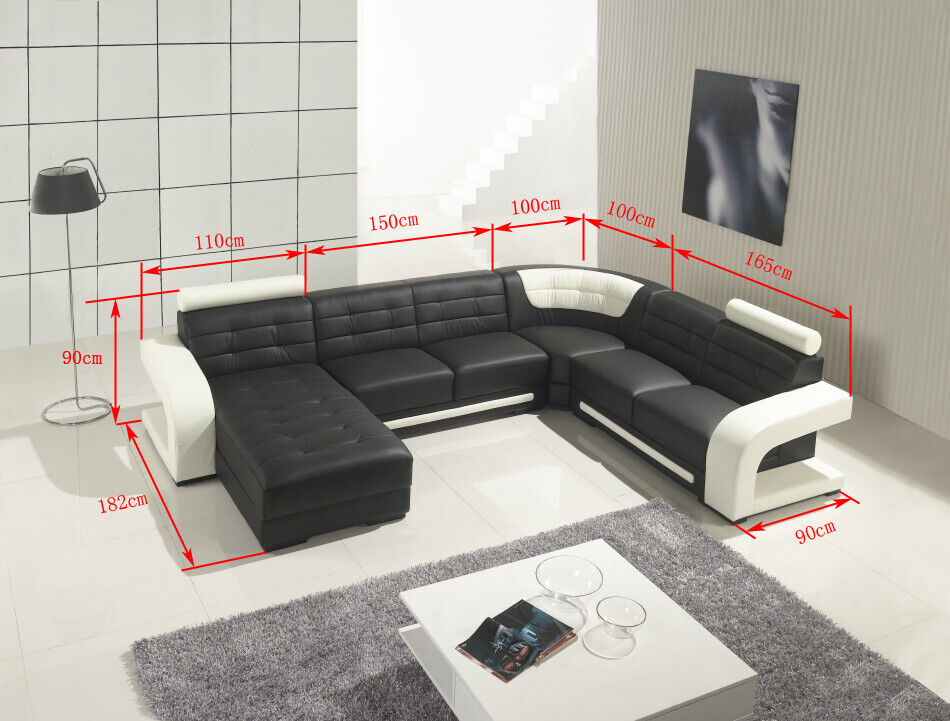 Den 'Wunnlandschaft Eckcanapé Eckgarnitur L Form Sofa Ecksofa Canapé Garnitur' bitt eng stilvoll an funktionell Léisung fir all Wunnzëmmer. Dëse Canapé, mat enger Dimensioun vu ca. 182 x 360 x 265 cm oder 265 x 360 x 182 cm, ass déi perfekt Kombinatioun vu Komfort a Stil. Mat enger Héicht vun ca. 90 cm, enger Sëtz Héicht vu ca. 42 cm, an enger Sëtzdéift vu ca. 59 cm, erlaabt et eng entspaanten Haltung. Den Ecksofa ass aus Premium Liederfaserstoff gemaach, deen aus 70% Lieder a 30% Polyester besteet, wat net nëmmen eng luxuriéis Textur, mä och Haltbarkeet garantéiert. Eng fräi Faarfwahl erméiglecht et, dëse Canapé perfekt mat all Dekor ze kombinéieren.