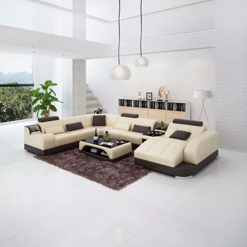 Kaaft eng U-förmeg Eckcouch, bëlleg, mat Ledercoussinéierung, Couch fir d'Wunnzëmmer.