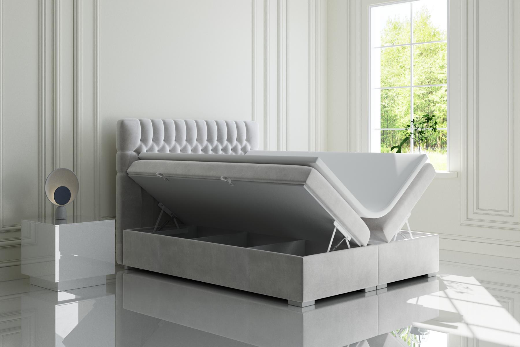 Dank der flexibeler Faarf- a Materialwahl ass d'Boxspring-Bett perfekt fir all Aart vun Interieur Dekor unzëpassen. D'Héicht vum Kappdeel vun 118 cm an d'Leefläch vun 65 cm suergen fir optimalen Sleeper Farkomfort. Egal ob fir e stilvollen Gaaschtraum oder als luxuriéis Ergänzung zu Ärem eegenen Schlofzëmmer – dëst Bett verkeeft en Touch vu Klasse a Gemittlechkeet. Kontaktéiert eis, fir méi iwwer d'Personaliséierungsméiglechkeeten vun dësem exklusiven Bett ze léieren.