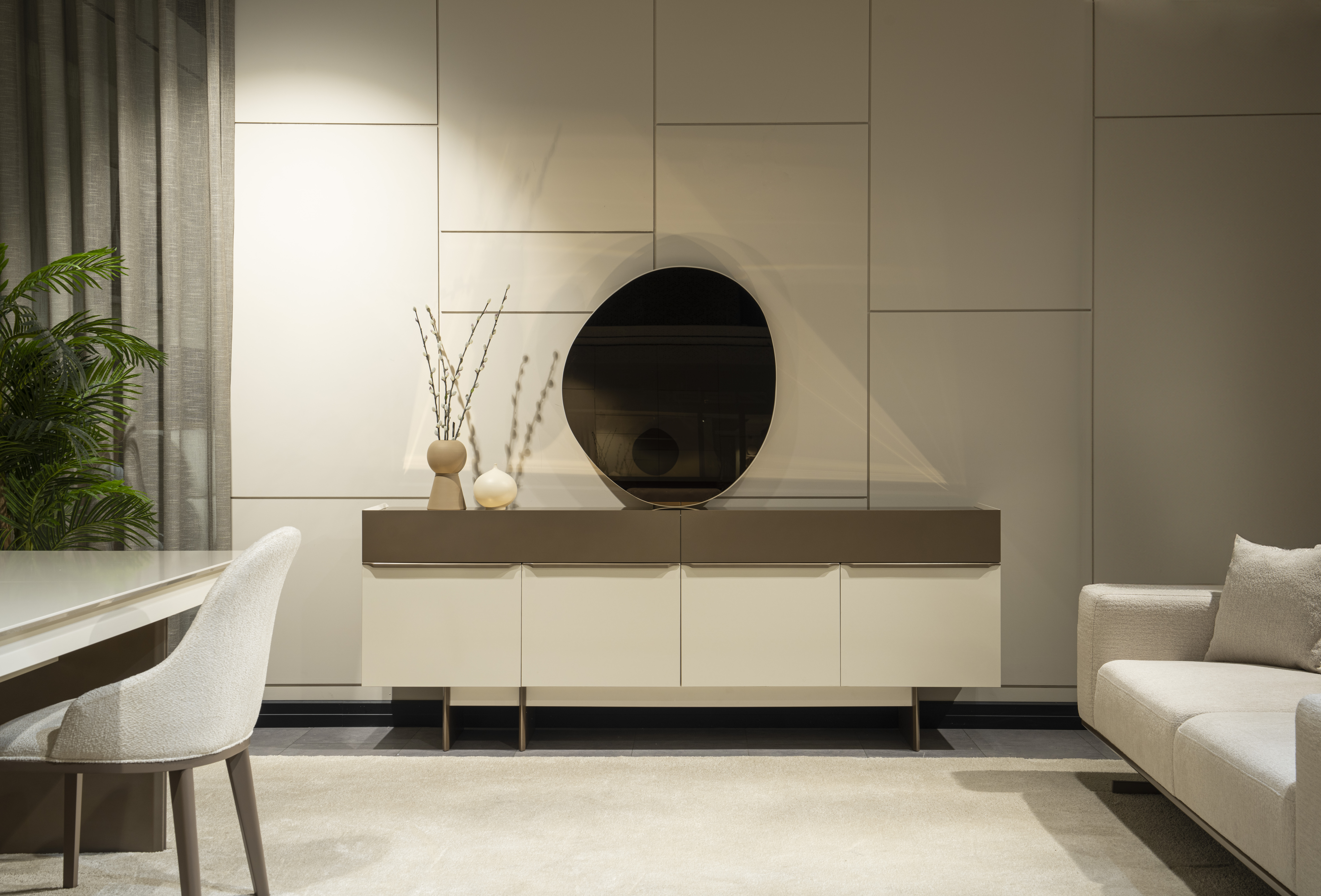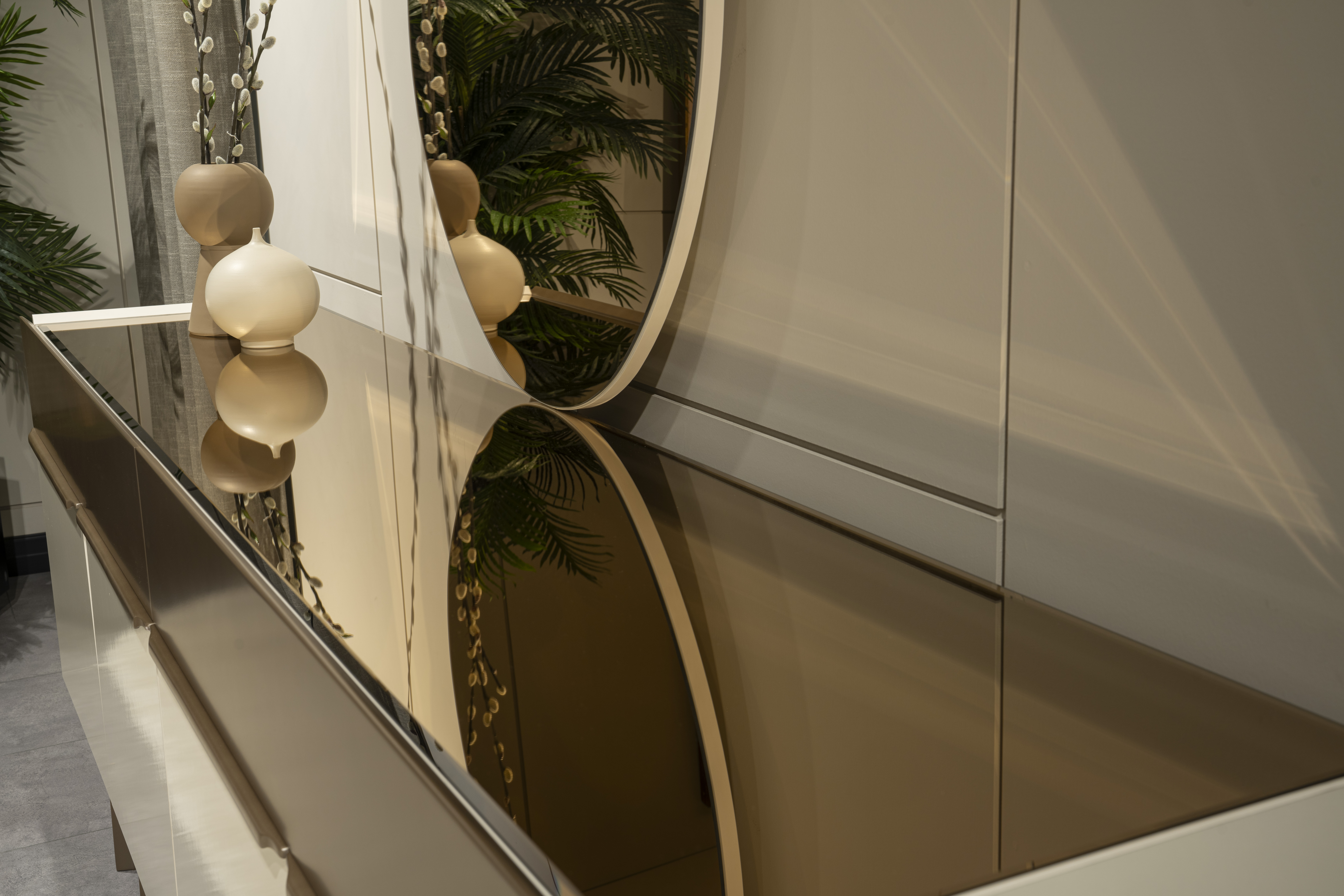 - Funktionalitéit:. D'Anrichte bitt grousszügëge Stauraum fir Geschir, Besteck an aner Utensilien, während de Spigel zousätzlecht Liicht a Raumgefill vermëttelt..
