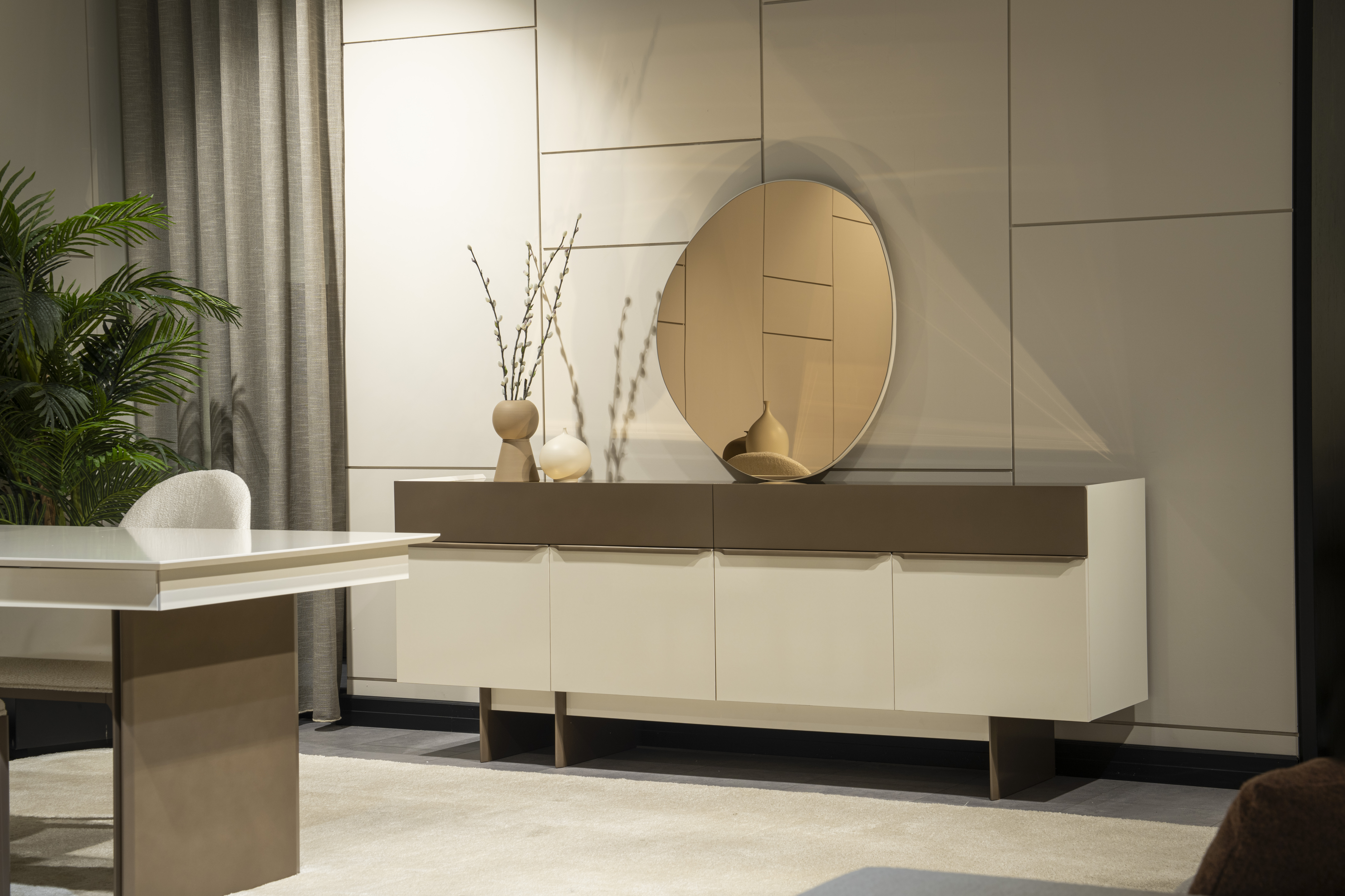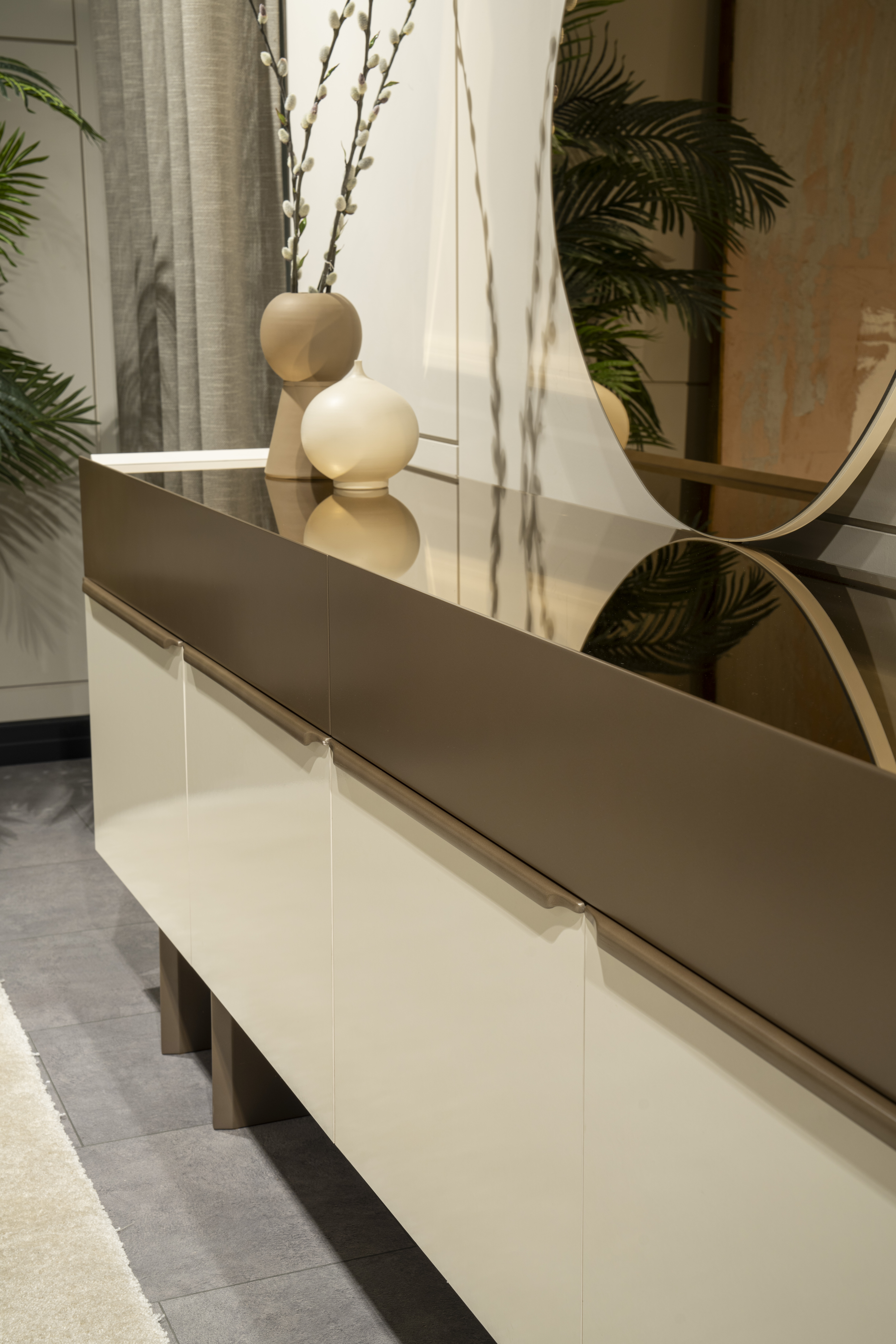Dës stilvoll Anrichte a Beige a Braun souwéi de passenden Spigel verleiht Ärem Iesszëmmer en Touch vu Luxus an Eleganz. Mat hirer héichwäerteger Holzveraarbechtung an dem gliesene Finish ergänzen se sech perfekt zu engem modernen a funktionalen Miwwelstéck.