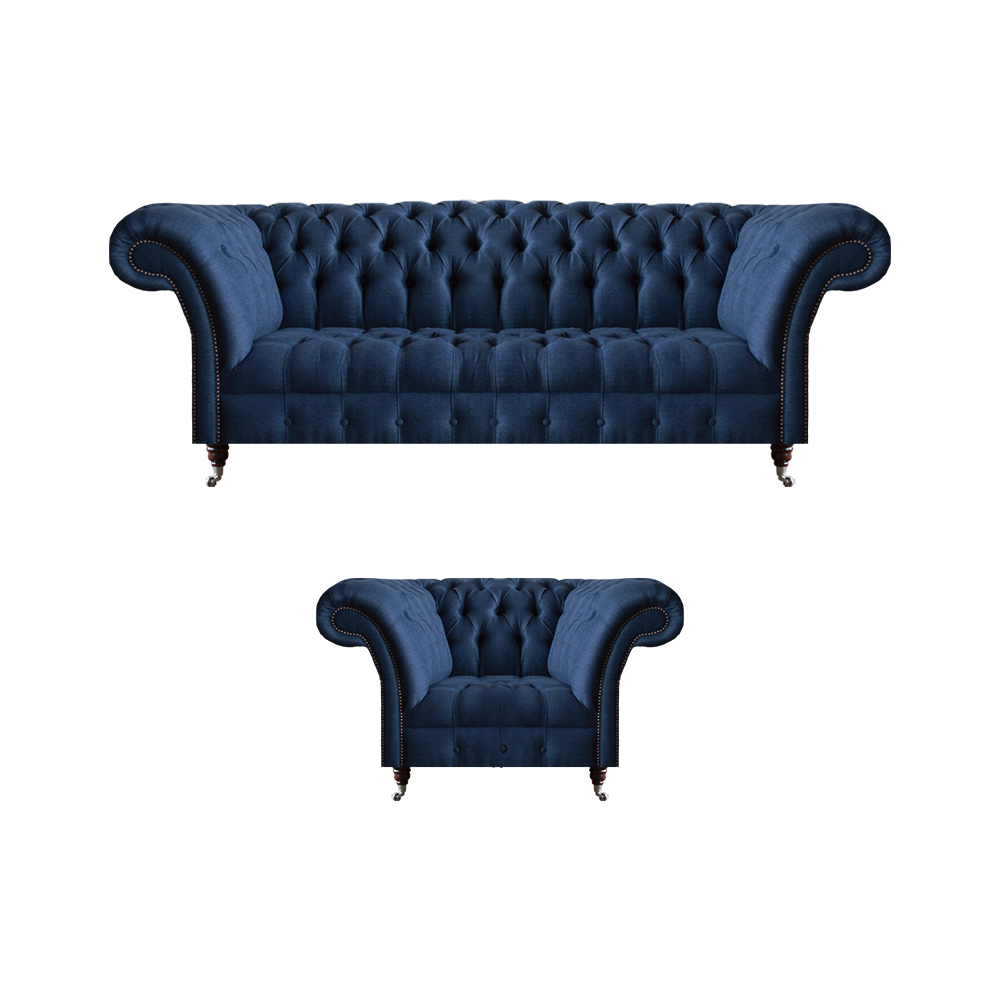 Entdeckt d'Luxus an d'Rennenheet vun eisem Däischterblo Croisaillon 3-Plaz Cours Designer Lehnsessel Édle 2-teileg Set. Dëst impressionnant Set bestëmm vu sengem elegante 3-Sëtzer Sofa an engem bequem Sessel, all zwee gepolstert mat premium Textil a verfierwt vu klasseschen Chesterfield-Knäppercher. Dëst kombinéiert klassesch Eleganz mat modernen Trends, a mécht et zu engem opfällegen Highlight an all Raum. Mat generéise Dimensiounen vu ronn 220 cm an enger sëtzkomforabler Héicht vu 42 cm, bitt dëst Set en formidaabelt Sëtzerfarung, ideal fir entspaanten Momenter doheem. Déi mëll, mat Knäppercher versehene Polsterung, verleiht all Raum en Hauch vu Raffinesse an Stil.