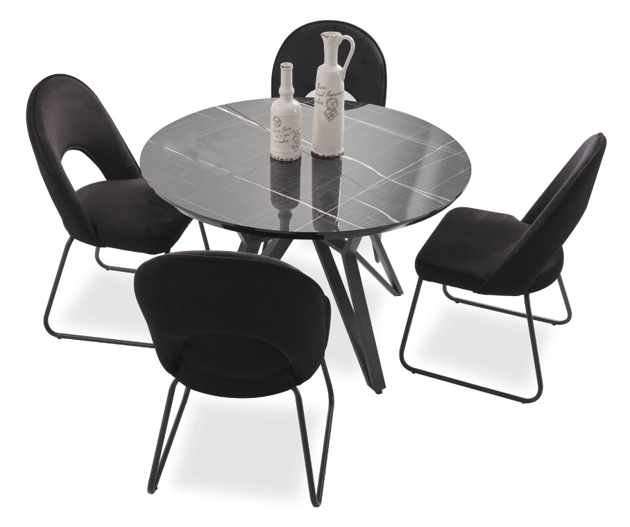 Den Luxus Iesszëmmer Set ass déi perfekt Ergänzung fir Äert Iesszëmmer. Dëse Set enthält en ausklappbaren Iessdësch mat Dimensioune vun ø 120 x 77 cm oder ø 140 x 77 cm, dee sech einfach vun 120 cm op 160 cm respektiv vun 140 cm op 180 cm verlängere léisst, fir all Geleeënheet. D'Dëschplack ass aus héichqualitativem MDF a gëtt duerch robust Edelstol Been ënnerstëtzt, wat fir eng elegant an modern Ästhetik suergt. Abegraff sinn véier bequem Still, déi aus Textil fabrizéiert sinn an an eng raffinéiert schwaarz Faarf montéiert ginn, mat anere Faarwen op Ufro verfügbar. Mat enger Sëtz Héicht vun 47 cm a Sëtzdéift vun 45 cm, erméiglechen dës Still eng komfortabel Sëtzerfarung.