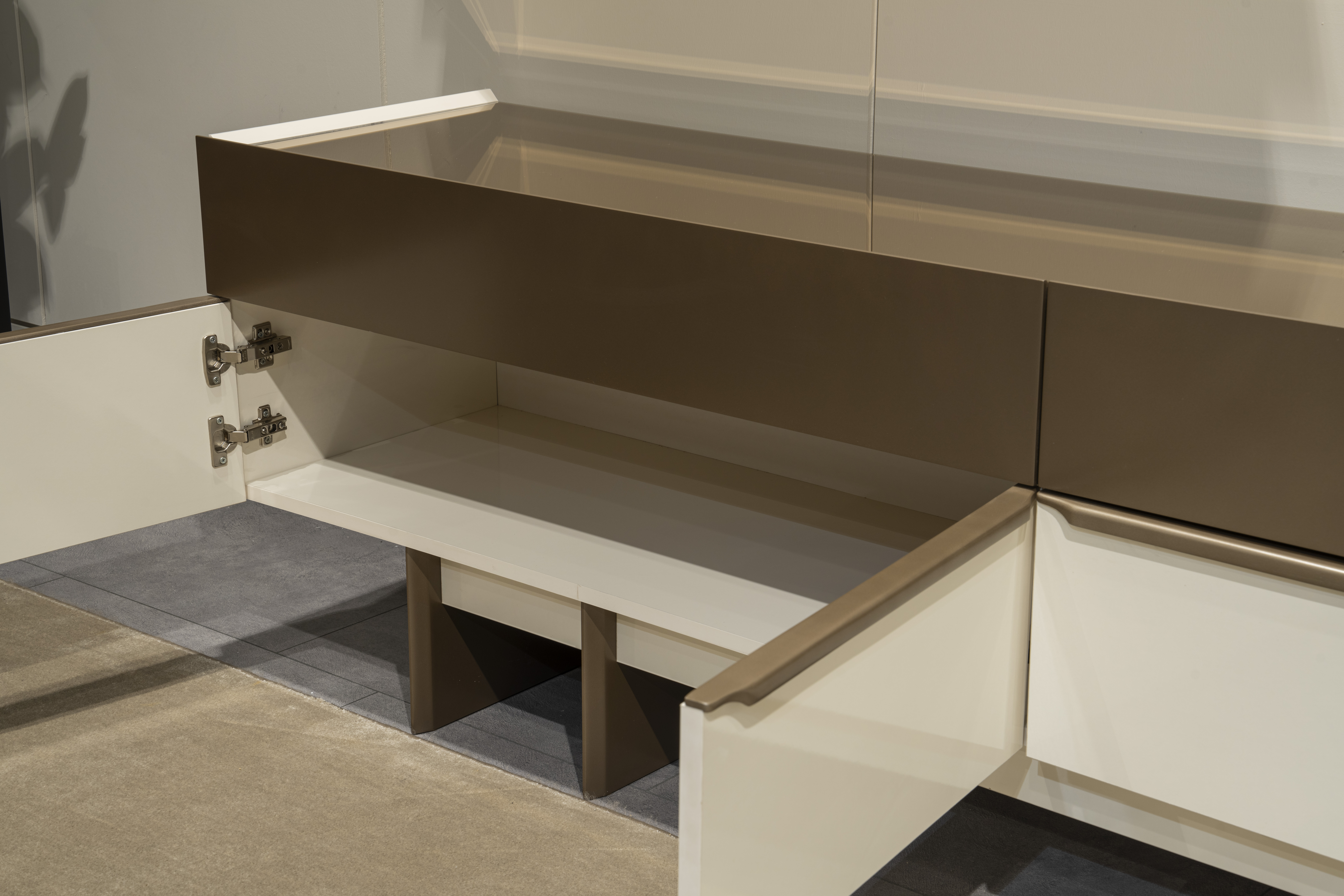 Sideboard an engem Wandregal, kombinéiert luxuriéis Design mat Funktionalitéit.