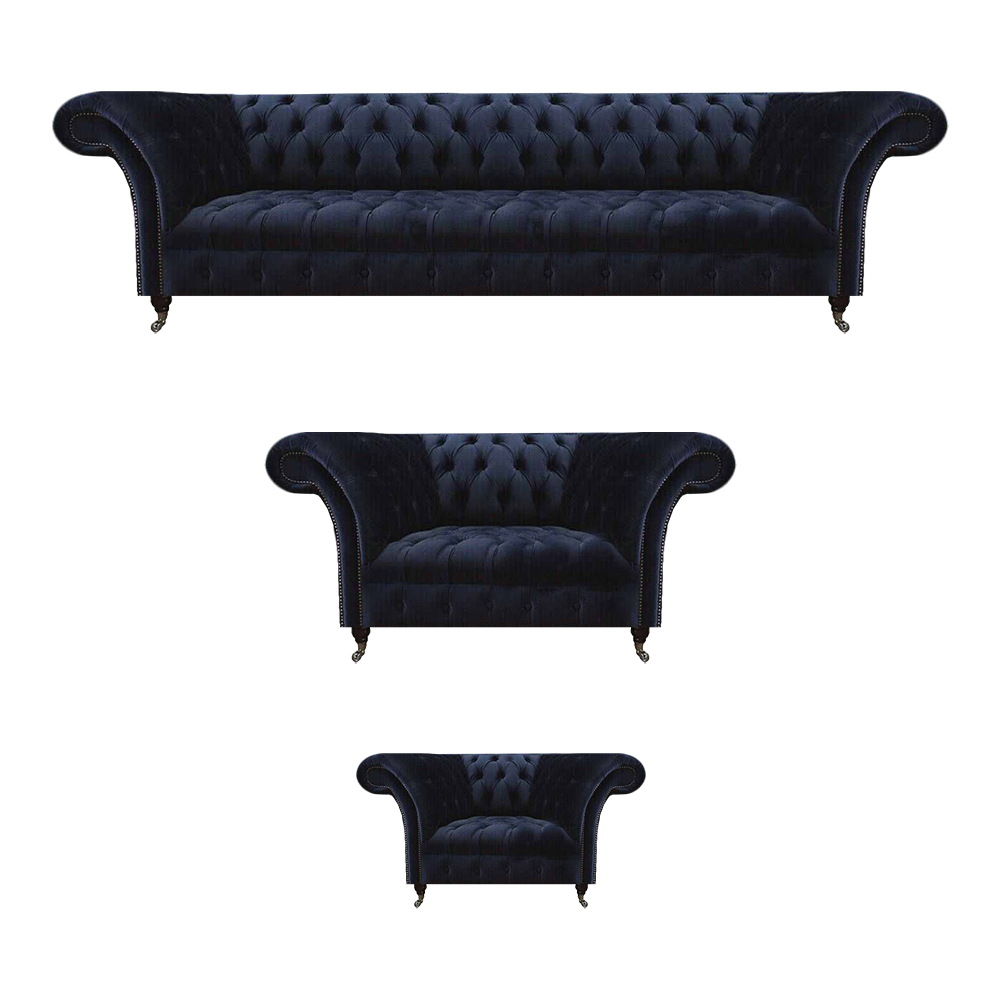 Wunnzëmmer Chesterfield Couchen Donkelblo Polster Garnitur 3 Deeler Set