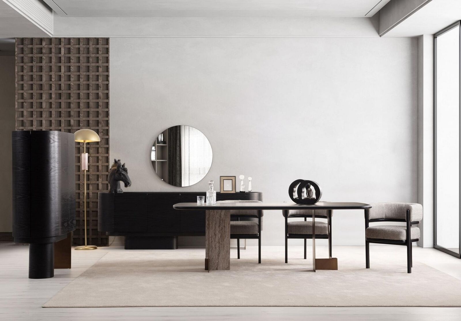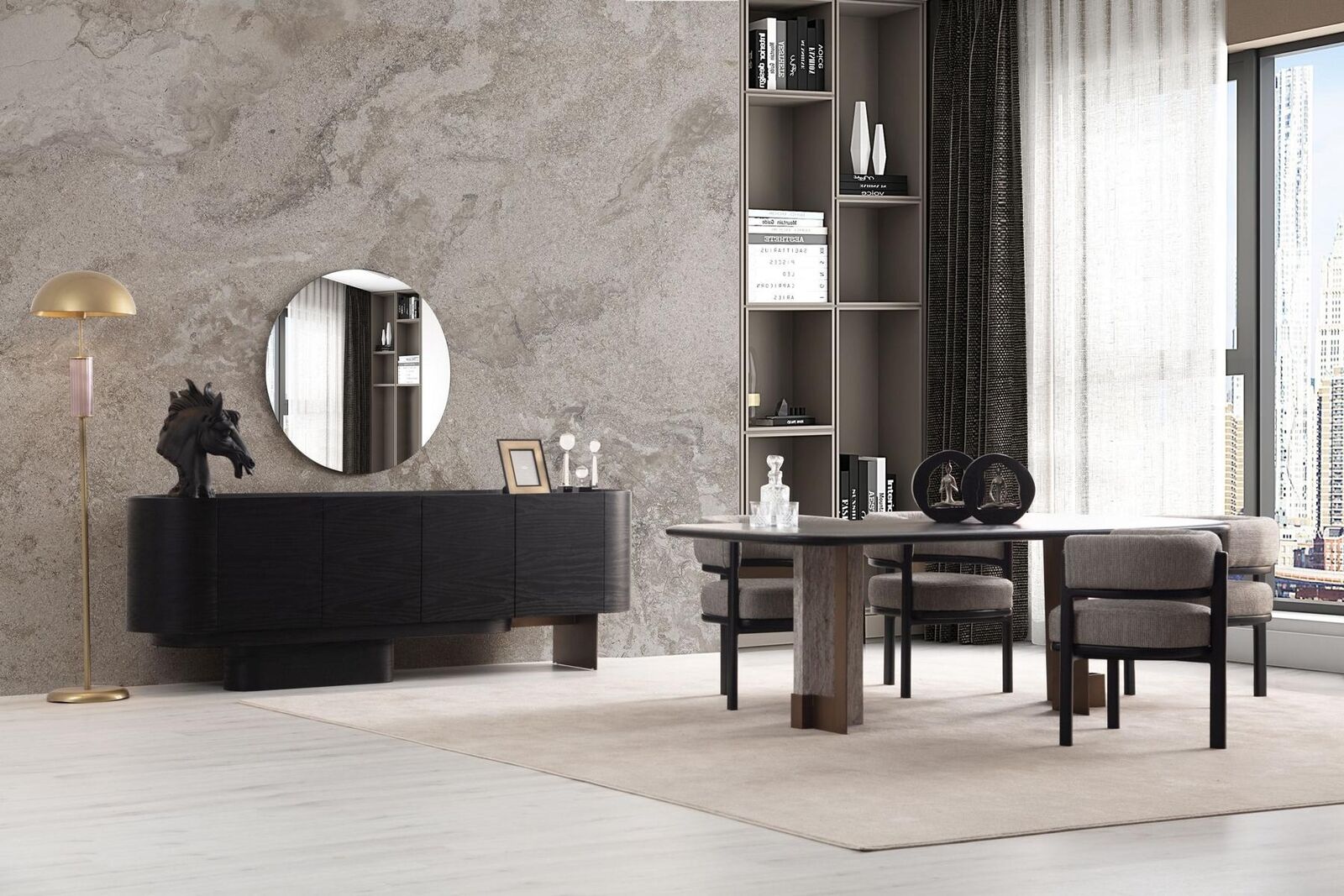 D'‘Designer Iesszëmmer Garnitur Iessdësch 6x Still Anrichte Spigel 9 Stécker’ ass déi perfekt Ergänzung fir Äert Iesszëmmer, déi en exklusive Stil mat héijer Funktionalitéit ubitt. Dës Garnitur besteet aus engem Iessdësch, sechs Still, engem Anrichte, an engem Spigel – all zesummen de perfekten Set fir e modern a sophistiquéiert Ambiance ze schafen. De Iessdësch, mat senge Moossen vun ca. 220 x 104 x 75 cm, bitt genuch Plaz fir Familljen a Gäscht an ass ideal fir grouss Owesiessen an Evenementer. D'Kombinatioun vun Holz, Textil a Glas an der Produktioun garantéiert net nëmmen eng staark an haltbar Konstruktioun, mee och en elegante Look an engem Design wéi ofgebilt.