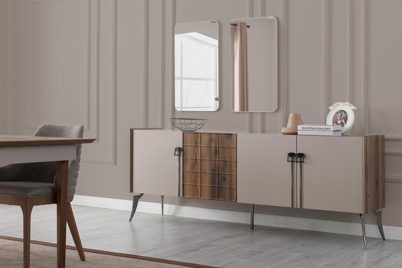 Dësen Iesszëmmer Set ass net nëmmen en esthetesche Genoss, mee funktionell. Mat senger grousszügiger Gréisst kann den Dësch en ideale Treffpunkt fir grouss Familljer oder Frënnversammlungen sinn. D'Kommode mat den zwee Spigelen offréiert net nëmmen zousätzleche Späicherplatz, mee erhéicht och d'Hellegkeet an d'Gefill vum Raum. Egal ob fir alldeeglecht Iessen oder speziell Occasiounen, den 'Exklusiv Iesszëmmergrupp' gëtt sécherlech e Begréissungspunkt a Gespréichthema an ärem Heem.