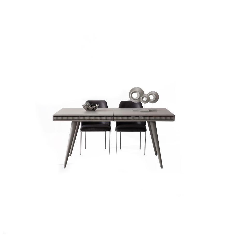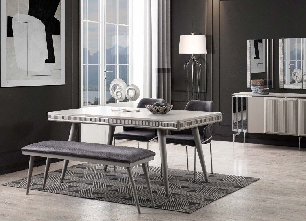 Mat der "Iessgrupp Iesszëmmermiwwel" kritt Dir net nëmmen en ésthetesch ugesinnlechen Set, awer och en extrem fonctionnellen, dee perfekt op gesëllege Familljeniessen oder op offiziellen Dinner Parteien passt. D'Still an de Bank bidde bequem Sëtzen, wärend de robuste Dësch genuch Plaz fir Är Platen, Dekoratiounen oder aner Accessoiren bitt. Dëse Set ass ideal fir grouss oder kleng Iesszëmmeren an ass e perfekte Choix fir déi, déi en eleganten an zougängleche Look fir hiren Iessberäich sichen. Fir déi, déi wëlle Gläichgewiicht tëscht ästhetescher Schéinheet a praktescher Notzung fannen, ass dëse Set déi richteg Wiel.