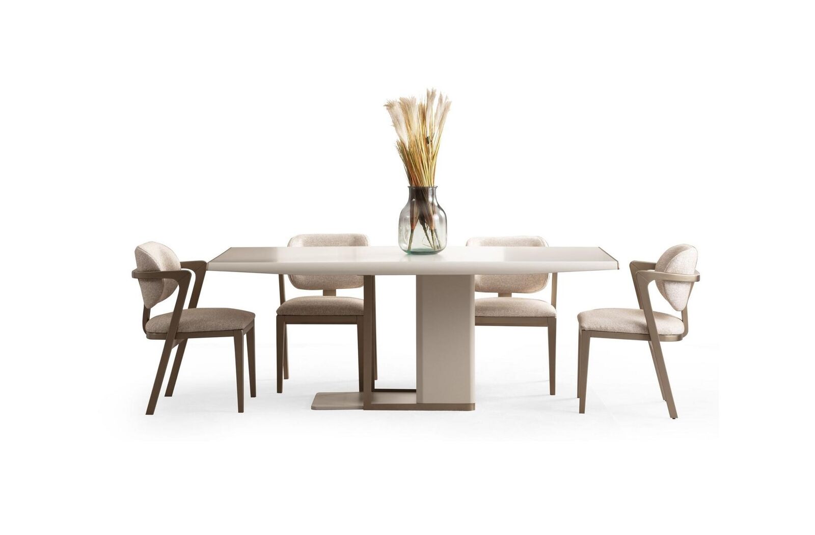 Dëse stilvolle Miwwelset ass ideal fir eng Vielfalt vu Szenarien, vu bequemen Owesiesse mat der Famill bis hin zu stilvollen Dinnerpartyën. Dank senger minimalistesch-schauspriechender Faarf, déi wéi op der Illustratioun oder op Ufro an anere Faarwen ze kréien ass, léist dësen Set sech liicht an all Interieur integréieren. Wéi wéinst dem ensembelen Design, kann dëse Set och an professionellen Ëmfeld wéi Versammlungssäll oder Bistros gutt agesat ginn. Mat dësem Set bréngt Dir Wärme, Eleganz an Raffinesse an all Raum.