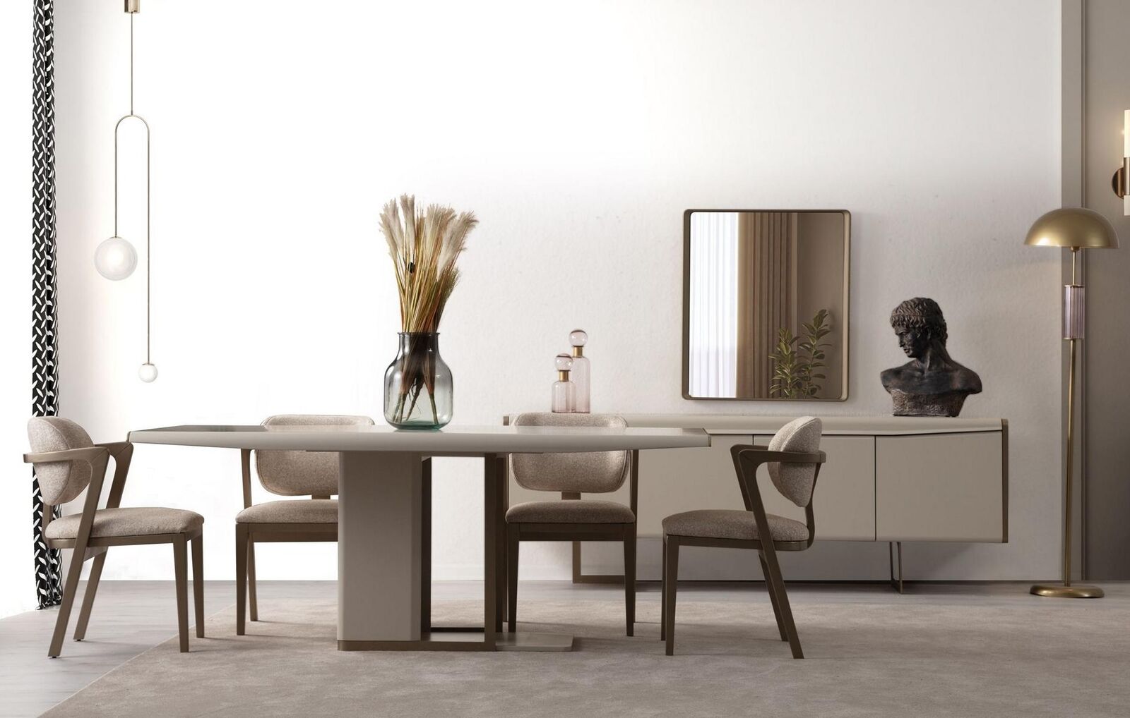 Entdeckt déi exzeptionell Béige Iesszëmmer-Garnitur Designer Iessdësch Gepolstert Still Luxus Anrichte, déi modern Eleganz an héichwäerteg Handwierk kombinéiert. Dës Garnitur enthält en impressionanten Iessdësch mat den Dimensiounen vun ongeféier 200 x 100 x 77 cm, deen aus enger stilvoller Kombinatioun vu Holz a robuste Metall besteet. D'Garnitur enthält och sechs gepolstert Still mat Moossen vun ongeféier 52 x 54 x 83 cm, déi e komfortabelt Ess-Gefill garantéieren an duerch hiren iwwerzeegenden Design perfekt an all Interieur integréiert kënne ginn. Eng raffinéiert Kommode, ëmfaassend 225 x 50 x 80 cm, bitt genuch Stauraum fir Är Iessgeschier an Accessoiren. Den elegante Spigel, mat enger Gréisst vun ongeféier 78 x 2 x 90 cm, ergänzt de Set op eng harmonesch Manéier a mécht Är Iesszëmmer nach méi beandrockend.