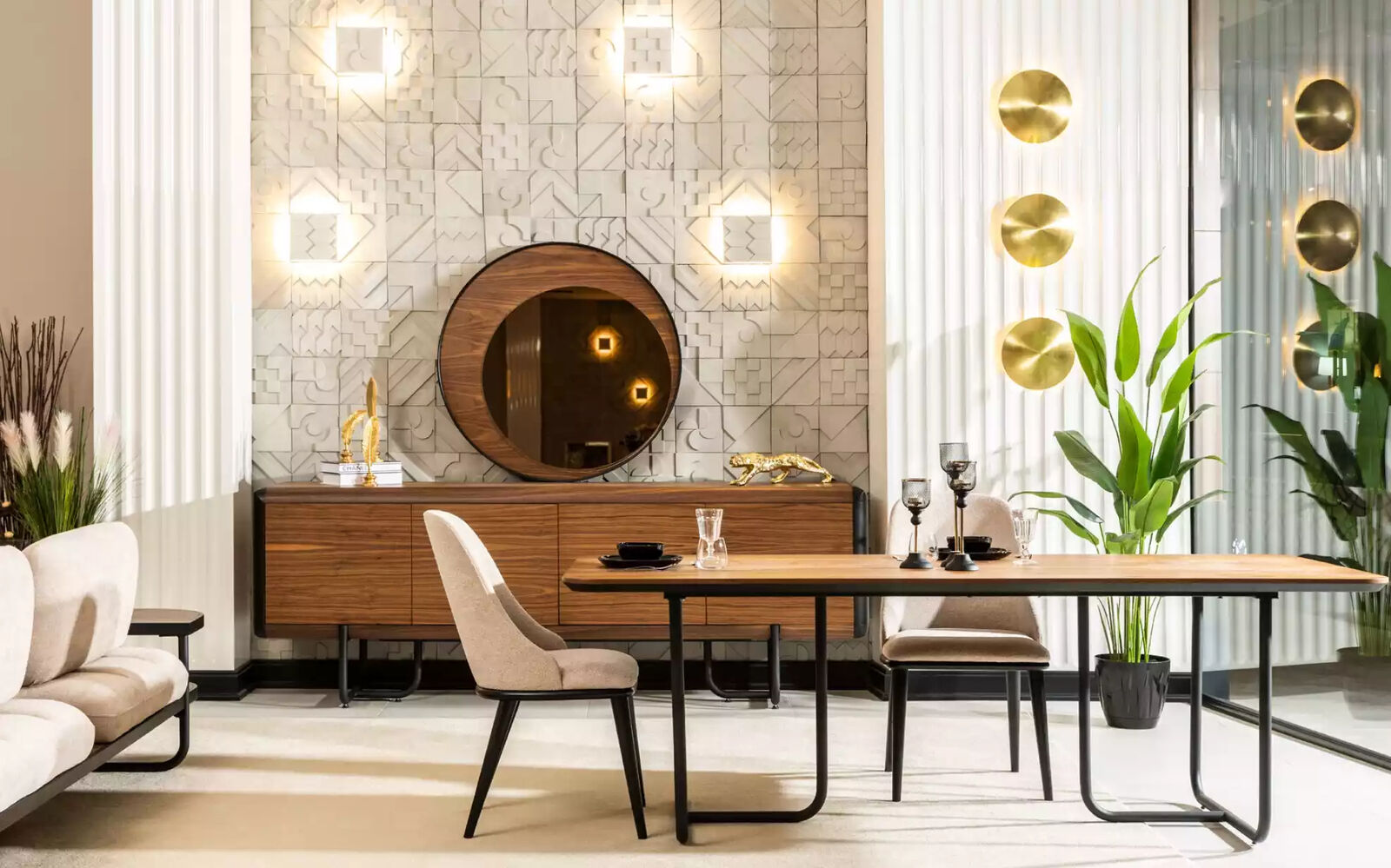 Dëse Set ass net nëmme schéin, mee och praktesch. Mat engem raimege Sideboard vu 240 x 50 x 82 cm bitt hien genuch Plaz fir Geschir, Besteck oder aner Saachen, déi Dir gäre bei der Hand hätt. De stylische ronnen Spigel mat engem Duerchmiesser vun 100 cm füügt net nëmmen e modernt Element bäi, mee hëlleft och, den Raum méi grouss a méi hell ze maachen. Egal ob fir alldeeglecht Iessen oder speziell Ugeleeënheeten, dëse stilvollen Set ass eng Topwahl fir jidderee mat engem Faible fir schéint Design an Funktionalitéit. Eg ass aus qualitativen Holzmaterialien gemaach, déi fir hir Haltbarkeet bekannt sinn, sou datt Dir iwwer Joren wäert beandrocken.