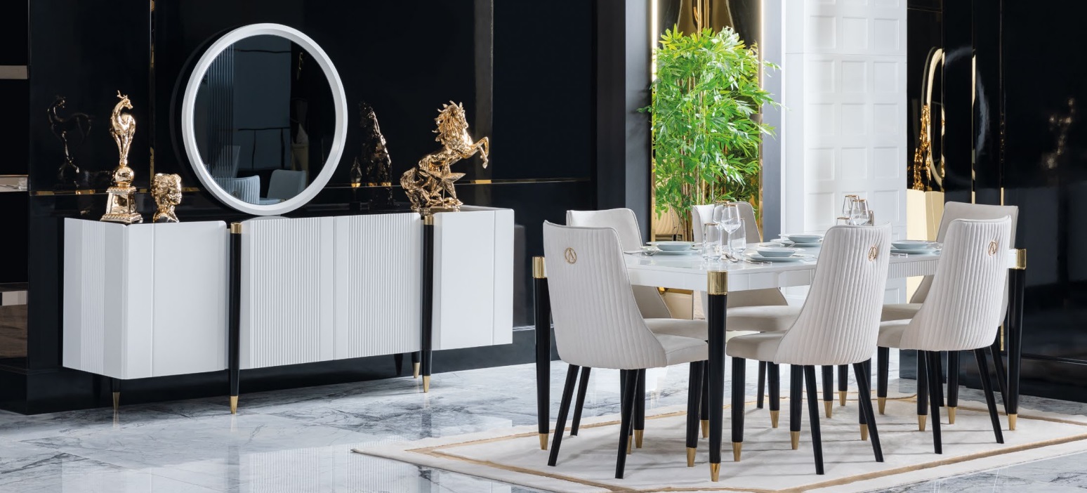 D'Garnitur "Iessdësch 6 Still Kommode Spigel Komplett Iesszëmmer Garnitur 9 Deeler Nei Set" bréngt eng stilvoll an elegant Atmosphär an Äert Heem. Dës exklusive Set besteet aus engem iwwerliewensgroussen Iessdësch vun ongeféier 190 x 100 x 78,5 cm, begleet vun sechs bequem Still, all vun ongeféier 50 x 50 x 94 cm. Mat hirem modernen Design an héichqualitativen Materialien, déi aus Holz a richtegem Holz fir d'Innenstruktur bestinn, bitt dës Set eng nachhalteg, ästhetesch a funktionell Léisung fir Ären Iesszëmmer.