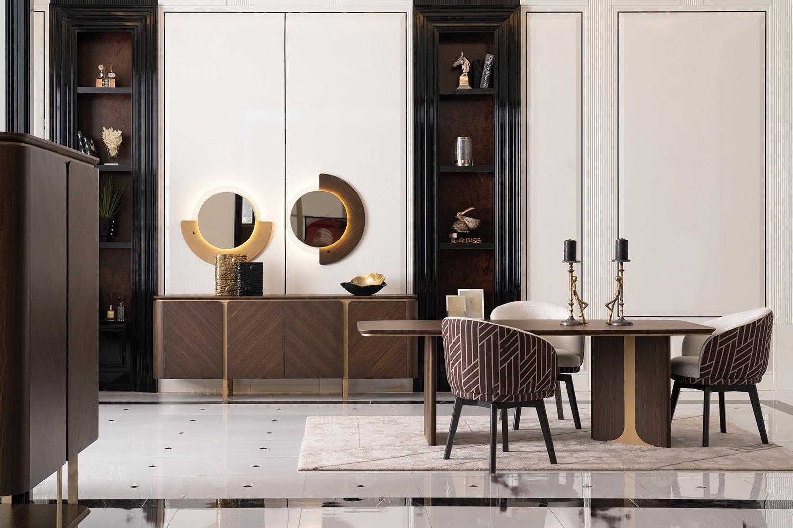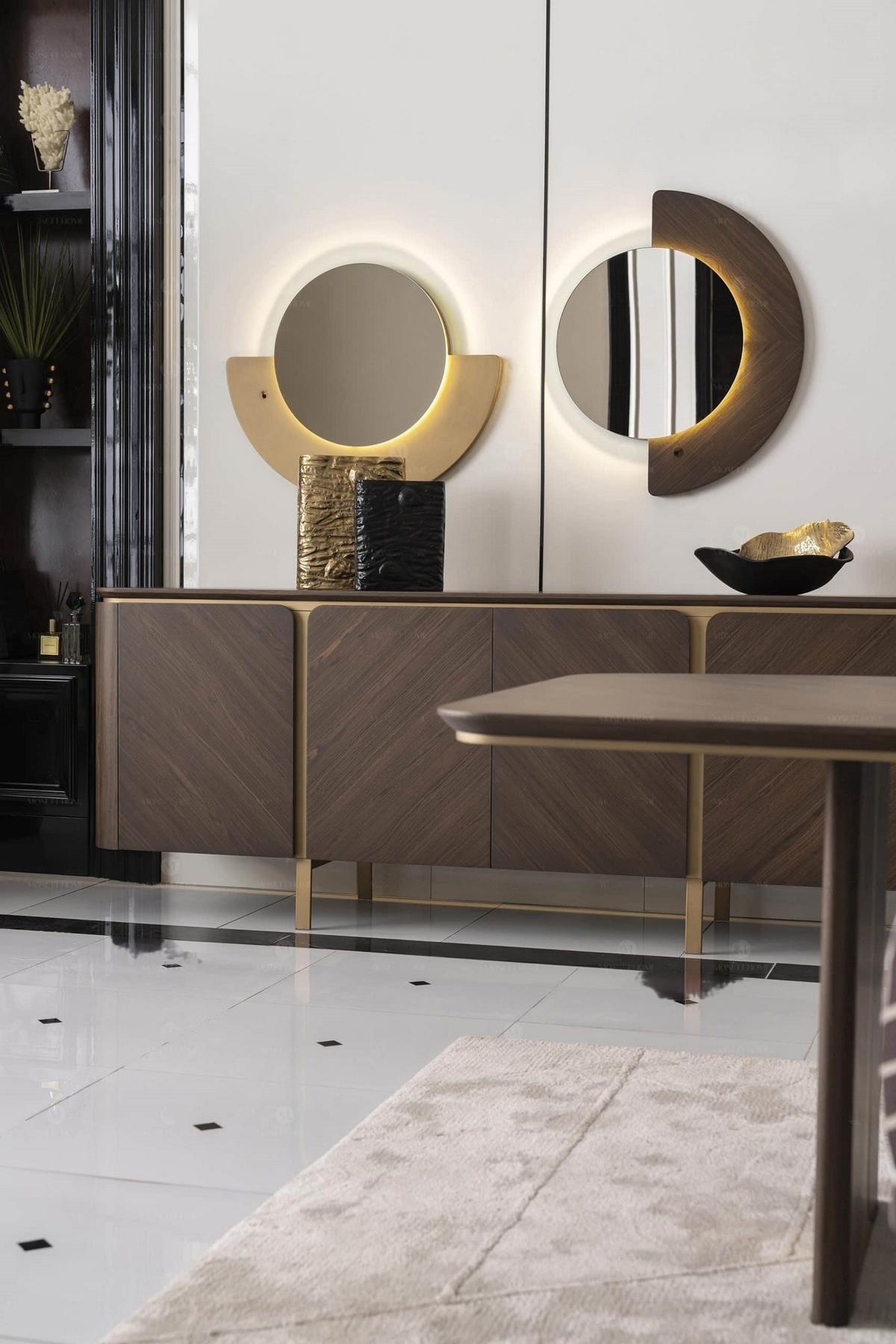 Mat dësem Set kënnt Dir Är Iesseck a méi wéi engem Raum notzen. Virstellt Iech, wéi Dir de Set fir offiziel Iessen mat Kollegen asetzt oder einfach en entspaanten Owesiessen mam Famill ugeet. D'Dekoratioun gëtt duerch d'Inklusioun vun zwee raffinéiert Spigelen mat enger Längt vu 80 cm perfekt ergänzt, déi liicht hëllefen, den iwwregens stilvollen Ofschloss vun Ärem Iessberäich ze erhéijen an Raum ze schafen. Dës Spigelen reflektéieren d'Liicht a schafen eng zousätzlech Dimensioun an Erweiderung vum Raum. Den Iessdësch-Set ass net nëmme funktionell, mee och e Mëttelpunkt von jiddwer Interieur, mat sengem robuste Bau a stilvollen Design, deen duerch seng robust Struktur an natierlech Faarwen zousätzlech erausstécht.