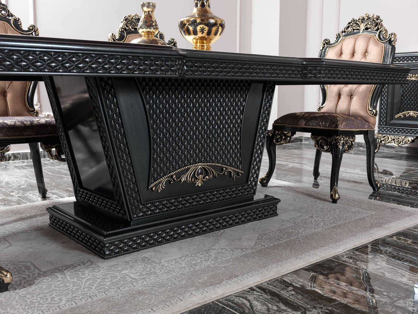 Dëse Set spigelt net nëmmen traditionell Handwierk, mee och d'Fäegkeet, sech un Ären eegene Stil unzepassen, mat Auswielméiglechkeete fir d'Faarf op Ufro. Ideal fir raffinéiert Dinnerpartyen oder alldeeglech Familljeowender, kann dësen Iesszëmmer Set mat senger klassescher Ästhetik an hiren prakteschen Dimensiounen an enger breeder Villfalt vun Interieuren benotzt ginn. Still mat enger Héicht vun 100 cm suergen fir e gewësse Stolz a Präsenz ronderëm den Dësch, wärend d'Breet an d'Héicht vum Sideboard (240 cm respektiv 100 cm) bidden genuch a praktesch Späicherméiglechkeeten. Et ass den ideale Choix fir déi, déi hir Wunnomgeving mat engem Mix aus klassescher Schéinheet a moderner Funktioun verfeineren wëllen.