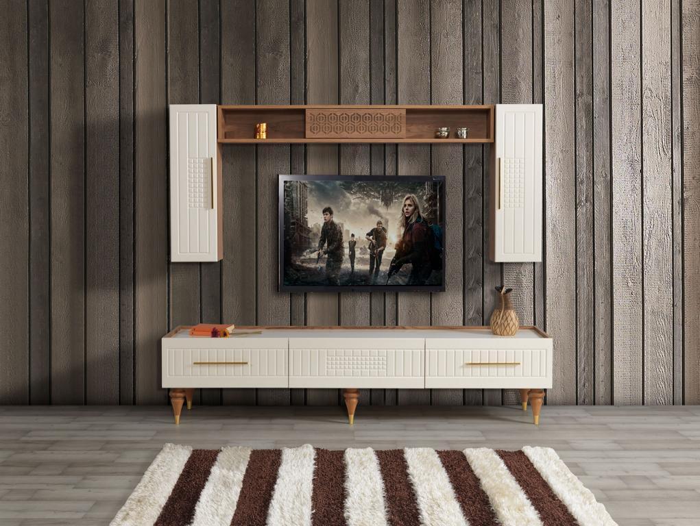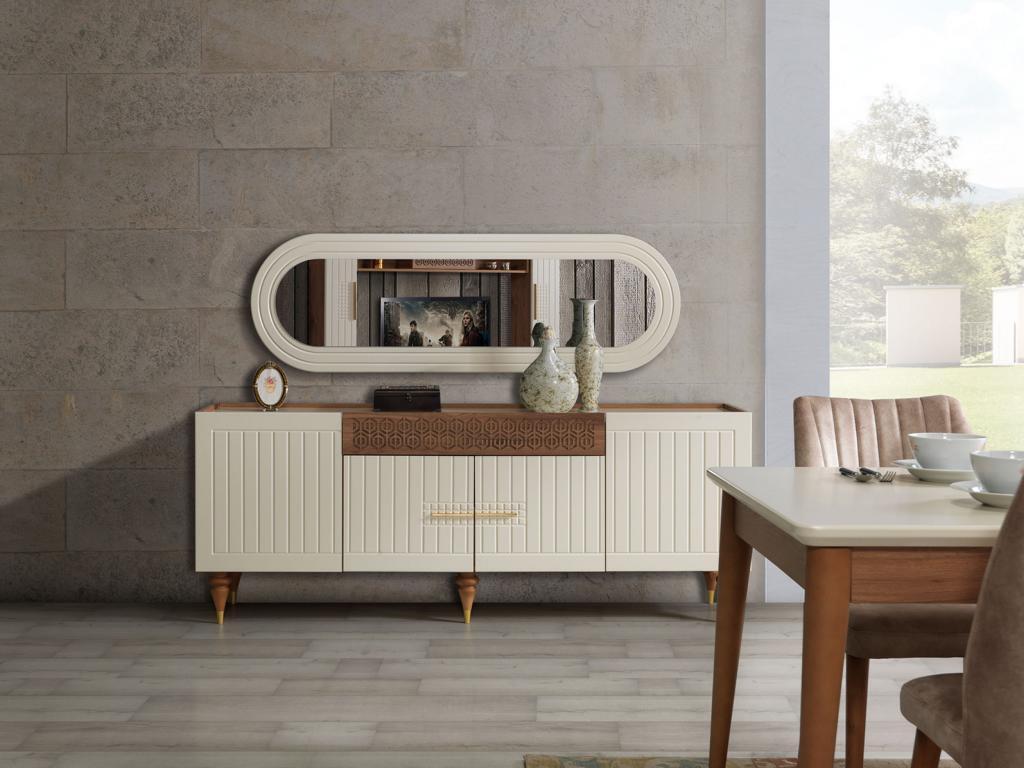 Genéisst déi Zäitlose Schéinheet vun dësem Iesszëmmer Set deen jidder Raum erhuewen a funktionell mécht. Mat engem elegante Buffet vun 201 x 46 x 77 cm ass genuch Plaz fir Är Geschir oder Deko ze verstauen. Maacht méi aus Ärem Wunnraum mat engem geraimegen TV-Stativ mat Dimensiounen vun 200 x 46 x 46 cm, deen all Är Media-Komponenten op eng ästhetesch Art a Weis plazéiert. D'komplementär Säitenschaf an Mauerregal bidden extra Späicherméiglechkeeten an e modernen Touch. Mat dësem Set kënnt Dir all Dag a Stonn an engem Ambiente verbréngen, deen op Komfort an Zesummeliewen ausgeriicht ass.