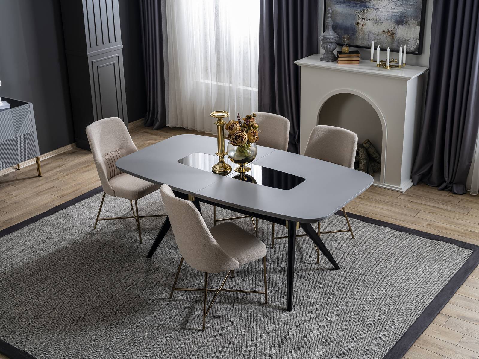 De Grau-wäiss Iesszëmmer Miwwelen Iessdësch Luxus 4x Gepolstert Still Modernen Set ass déi perfekt Ergänzung fir all modern Heem, thanks zu sengem elegante Design an héichwäertege Materialkombinatioun. De Iessdësch, mat enger Gréisst vu ca. 180 x 100 x 81.5 cm, kann einfach op 200 cm oder souguer 220 cm verlängert ginn, wat et ideal mécht fir méi grouss Versammlungen oder spezielle Geleeënheeten. Dëst Set kombinéiert Holz, Textil, a Metall fir e raffinéiert Look, deen zu engem modernen Ambiente passt. D'bësseg Faarwenen an d'moderne Linne suergen dofir, datt dëse Set nahtlos a bal all Zëmmer schéngt.