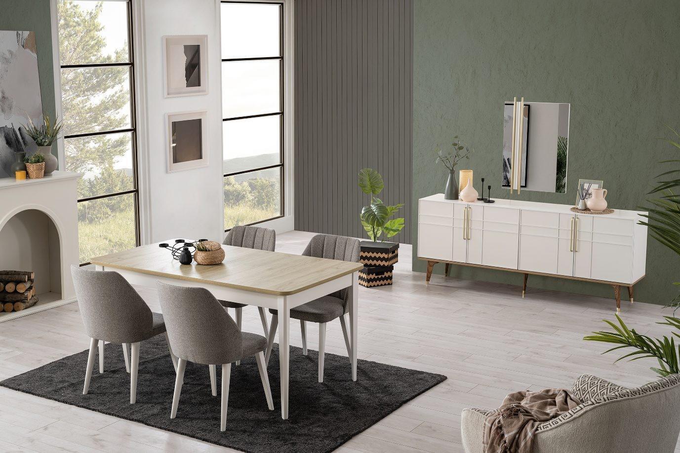 Niewent dem Iessdësch an de Still enthält de Set och e praktescht Sideboard, dat mat enger Längt vu ca. 214 cm, enger Breet vu 44 cm a Héicht vu 80 cm vill Stockageplaz bitt fir Geschir oder dekorativ Objeten. Fir d'Raumgestaltung harmonesch ofzeschléissen, kënnt e Spigel an der Gréisst vun ca. 60 cm Längt an 80 cm Héicht dobäi. All Miwwelstéck ass aus qualitative Holz a Stoff gemaach, dat fir eng laang Liewensdauer suergt. Idealerweis kann de Set an engem modernes Appartement oder Haus placéiert ginn an ass perfekt fir Iesszëmmer, déi gäre vill Leit zesummebréngen oder en eleganten Touch wëlle bäifügen. Entdeckt den optimalen Mix aus Ästhetik a Funktioun mat dësem Iesszëmmer Set.