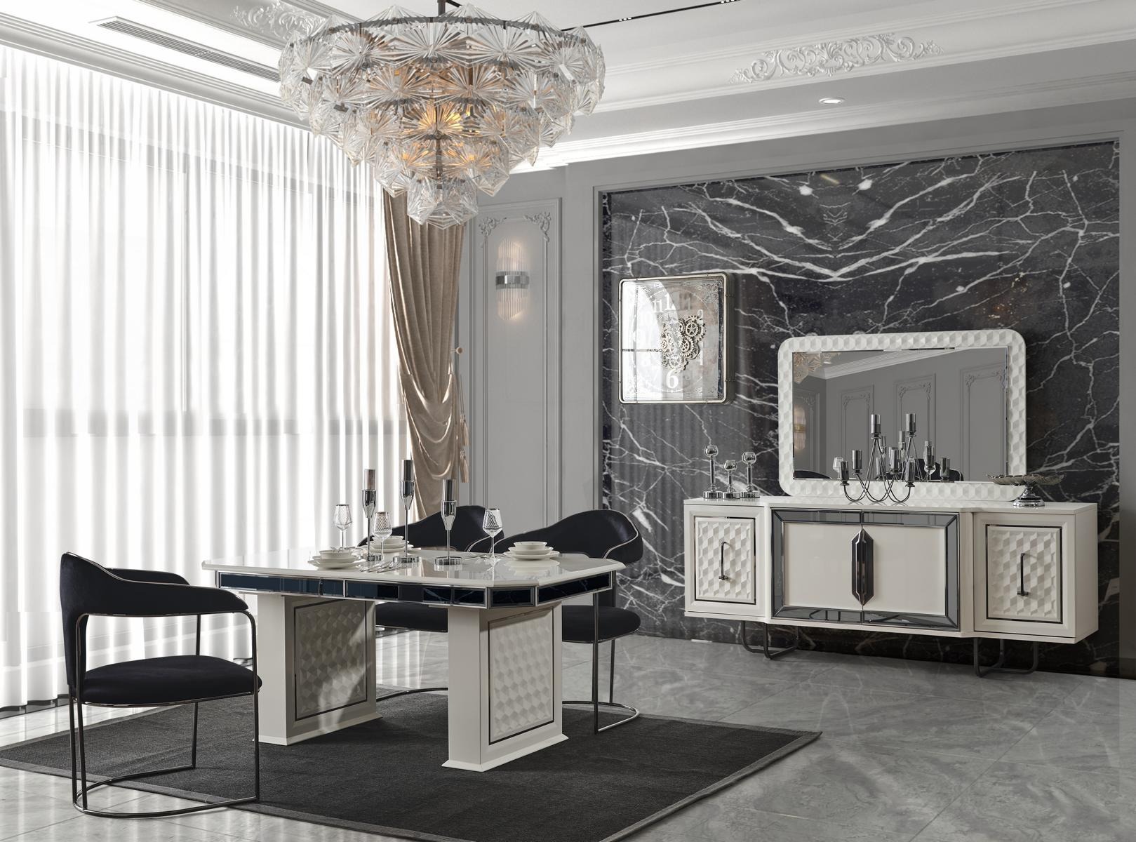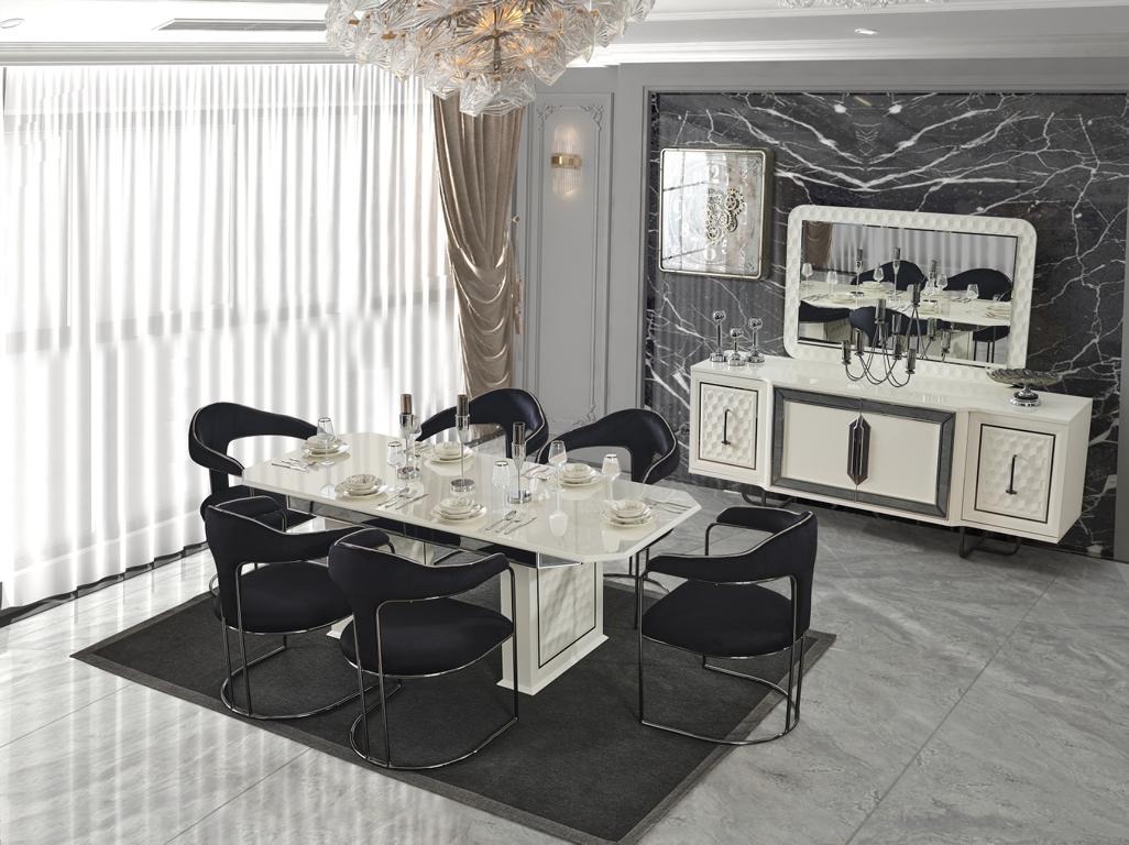 Mat senger duebler Funktionalitéit a schéinem Finish ass dës Garnitur perfekt fir Familljen Iessen oder och fir grouss Zesummekommen. Déi inklusiv Anrichte mam Spigel erméiglecht et Iech, all noutwendeg Iessgeschir oder aner Accessoiren stilvoll an der Géigend ze halen, wärend de Spigel d'Liicht a Raumgefill an Ärem Iesszëmmer erhéicht. Egal ob et en alldeeglechen Iessen oder eng speziell Geleeënheet ass, dës Garnitur suergt dofir datt Ären Iessberäich funktionell a gläichzäiteg ästhetesch bleift. Et ass déi ideal Entscheedung fir jiddereen, deen no Praktikitéit gekoppelt mat Stil sicht.