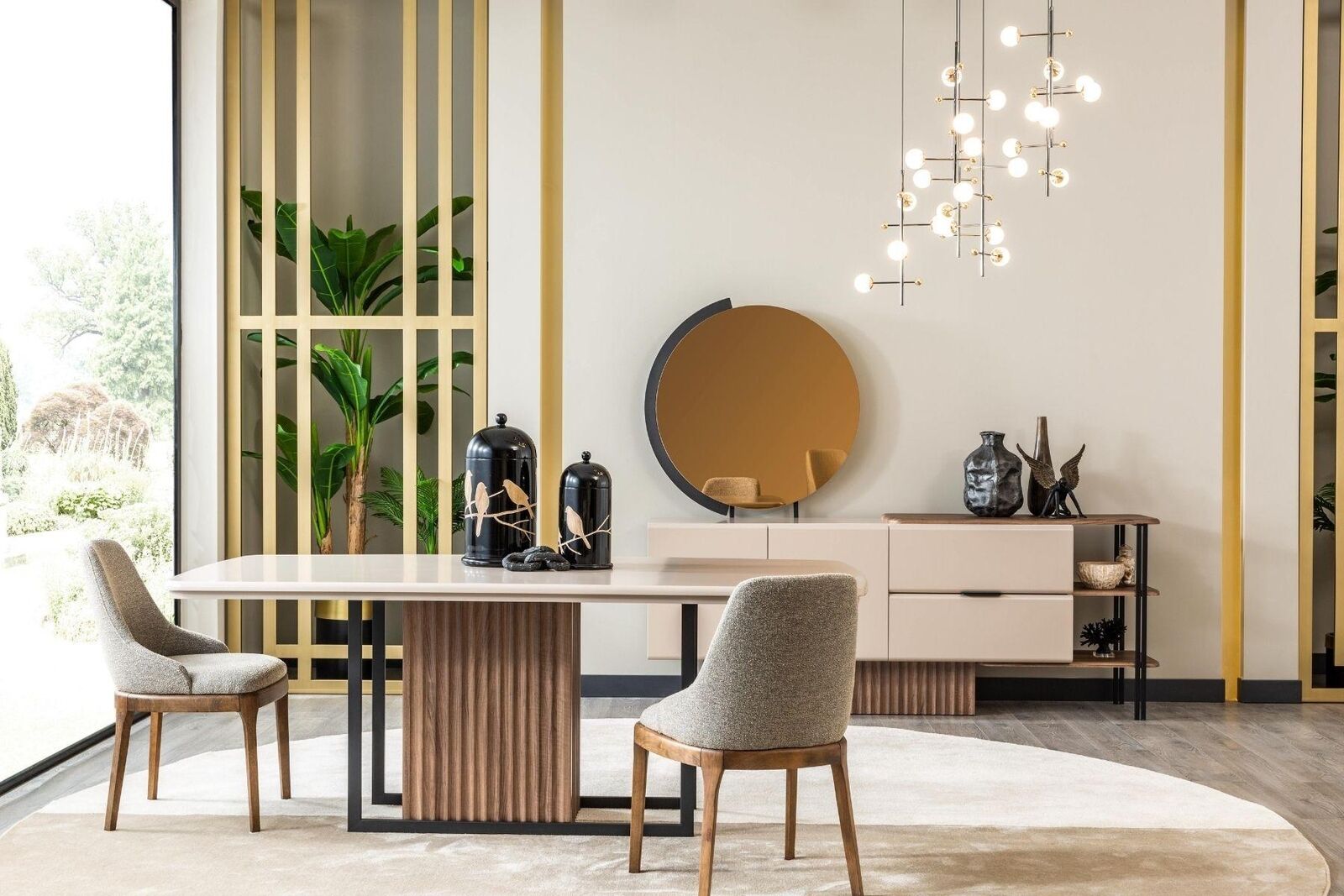 Des Weideren enthält dësen Set en **stilvollen Sideboard**, mat Dimensiounen vun 2.15 cm Längt, 48 cm Breet, an 83 cm Héicht. Dës **vielfälteg Stéck** kann benotzt gi fir Geschier, Besteck oder aner Essenziellen ze verstauen, déi een bei enger Moolzecht gebrauchen kann. De **quadratesche Spigel**, jeeweils vun 95 cm Längt an Héicht, an enger Déift vu 3 cm, füügt en eleganten Akzent bäi, an hëlleft fir den Raum méi grouss an méi hell wierken ze loossen. Dësen komplette Set ass ideal fir déi, déi hir **Iessecken an Deluxe a Komfort** transforméieren wëllen, wärend se praktesch Léisungen an ärem Alldag bidden. Egal, ob dir eng Famillenowend plangt oder e souzegen Dinner, dësen Iessgrupp ass perfekt fir all Situatiounen.