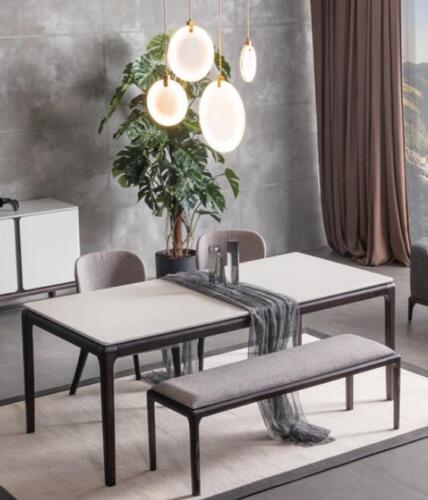 Dëse Iesszëmmer Set ass extrem versatile an erlaabt et Iech, en Iessberäich ze genéissen, deen net nëmme funktionell, mee och ästhetesch zefriddestellend ass. Mat enger praktescher Bänk vu 140 cm an der Längt kënnt Dir weider Gäscht einfach empfänken. D'Kichenanrichte bitt ëmfangräich Stauraum an ass duerch hir 210 cm Längt a 50 cm Breet besonnesch praktesch an allgemeng ugepasst fir Är Iessgeschier an Dekoratiounen ze verstoppen. Duerchsäilege Stilsprooch an d'Benotzung vun edlen Materialien maachen dëse Set zu enger optimaler Wiel fir déi, déi en extra Touch vun Eleganz a Funktionalitéit an hirëm Iesszëmmer sichen.