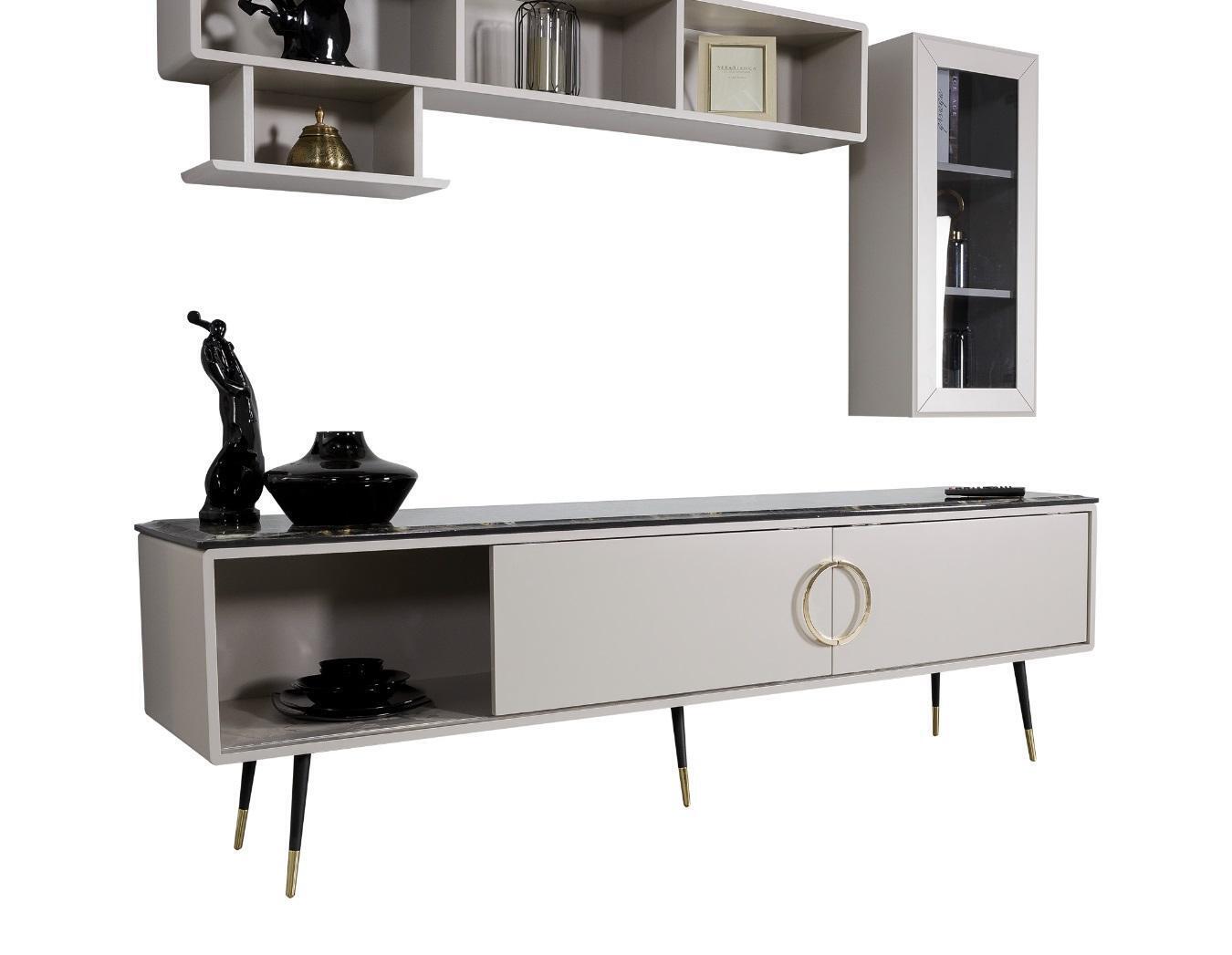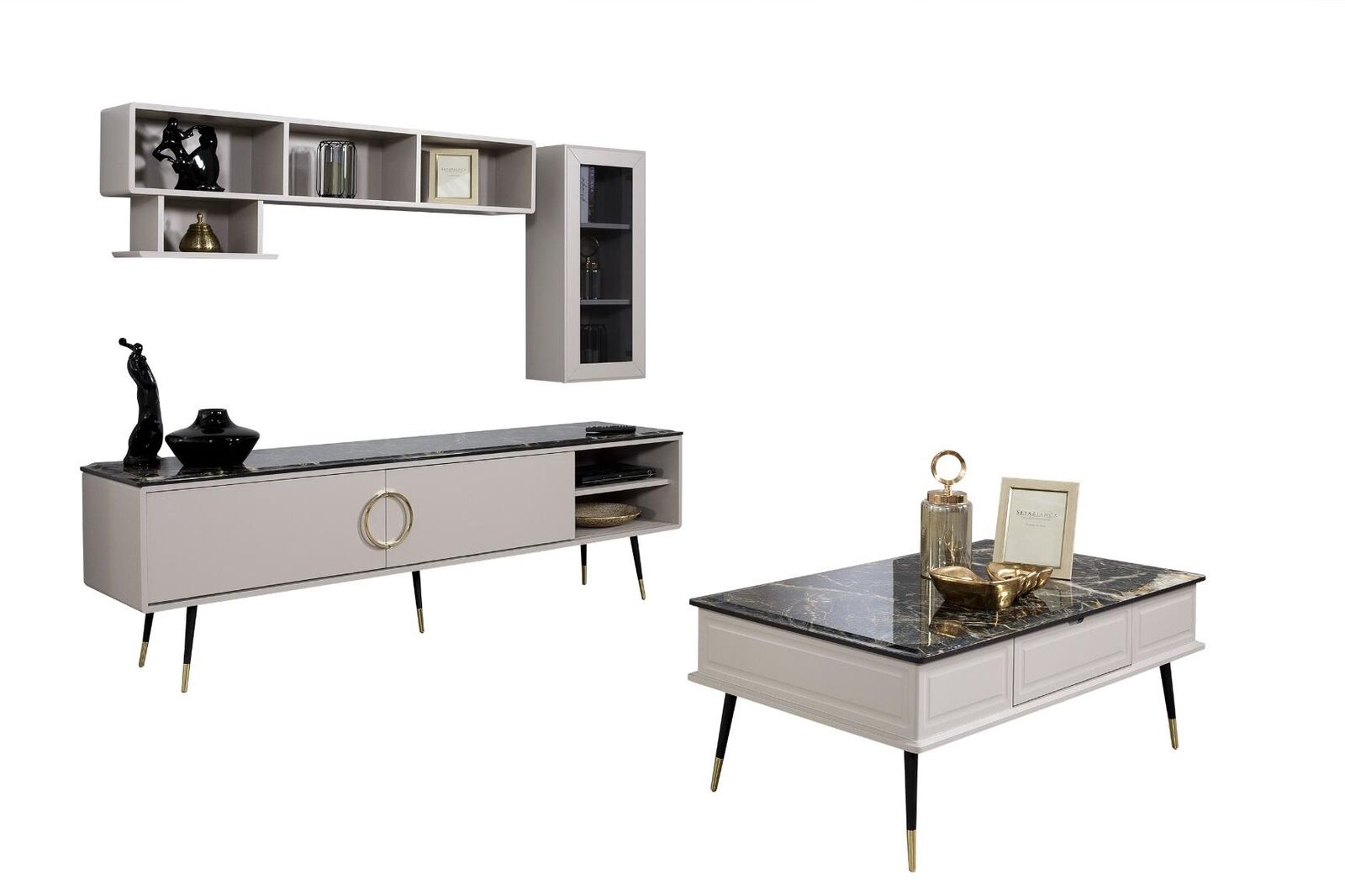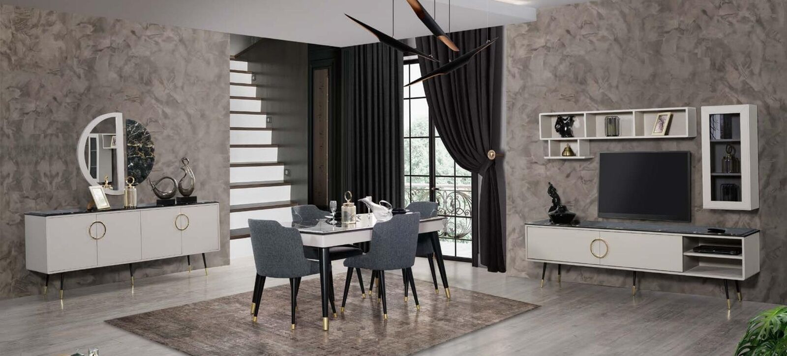 Zousätzlech zum Dësch a Stillsäit, enthält dëse bemiechten Iesszëmmer Set eng elegant Anrichte mat der Gréisst vu 205 x 48 x 80 cm, déi vill Plaz fir Gedeck, Besteck oder aner Iesszëmmereessenszubehor bitt. Zousätzlech gëtt eng RTV Anrichte mat grousse Dimensiounen 205 x 48 x 62 cm fir Fernsehgeräter oder Multimedia-Apparater. Däi stilvoll an vielseitig Einrichtungsset entfalt seng voll Funktionalitéit bei elegannten Owesiessen mat Frënn oder wann déi ganz Famill un enger Iesszëmmerzuammenkonft versammelt ass. Den Design ass eng perfekt Kombinatioun aus Esthetik a Funktionalitéit, an et kënnen op Ufro nach weider Stécker an aneren Faarwen bestallt ginn, fir d'Set un all Stil oder Interieur unzepassen.