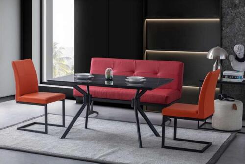 Dëse Set ass ideal fir en Iesszëmmer, dat eng moderan an organisiert Atmosphär brauch. De schwaarzen Iessdësch bitt genuch Plaz fir d'Familljeniesse an ass och perfekt fir Dinnerpartien oder kleng Versammlungen mat Frënn. D'Stiller, mat hire gemittleche Konschtleedersëtzer, bidden en onvergleichlechen Sëtztkomfort, wärend d'Bänk eng stilvoll Alternativ oder Ergänzung zu de Still ubitt, suergend fir extra Sëtzraum bei aussergewéinleche Geleeënheeten. Mat sengem haltbare a robuste Bau ass dëse Set ee festen Investissement, deen Äert Iesszëmmer aalzt an opkloerst, wärend en en zäitgenësseschen a luxuriéisen Akzent gëtt.