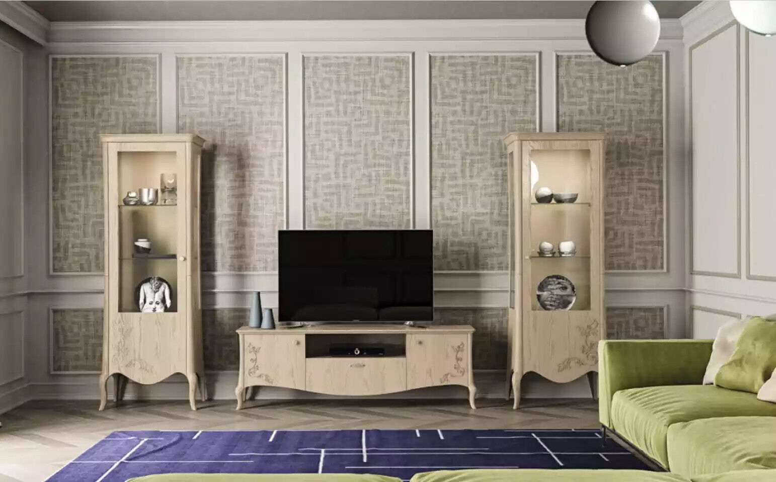 Dëse Set bidd endlos Méiglechkeeten fir personaliséiert Heemgestaltungen, wat et perfekt mécht fir verschidde Wunnzëmmerdesignen. De TV-Stänner hält Äre Bildschierm op der richteger Sichthéicht, während d'Vitrinnen ideal sinn, fir Är Léifsten Bicher, Sammelstécker oder aner wäertvoll Objekt an der Vitres ze weisen. Dëse liichtegfltzt Holzlook verleeft Ärer Wunnfläche eng Zäitlos Eleganz, déi einfach mat aneren Dekorstiler harmonéiert. Entdeckt d'Villsäitegkeet an d'Prakteschkeet vun dësem luxuriéise Mobiliärset an erfëllt all Äert Wunnraum-Bedürfnisser op eng stilvoll Manéier.